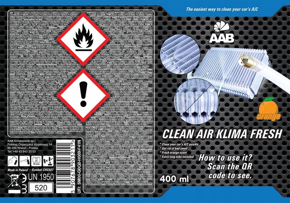 48 x AABCOOLING CLEAN AIR KLIMA FRESH 400 мл — новейшее аэрозольное средство от AABCOOLING для эффективной очистки автомобильных систем кондиционирования и вентиляции, а также домашних кондиционеров. Улучшенная формула активных ингредиентов эффективно очистит и устранит неприятные запахи, подарив вам и вашим близким невероятную свежесть и чистоту воздуха с оттенком нежного апельсинового аромата. Изделие не оставляет жирных пятен и очень легко чистится.Не откладывайте чистку кондиционера на потом! Начните заботиться о своем здоровье и здоровье своих близких!
