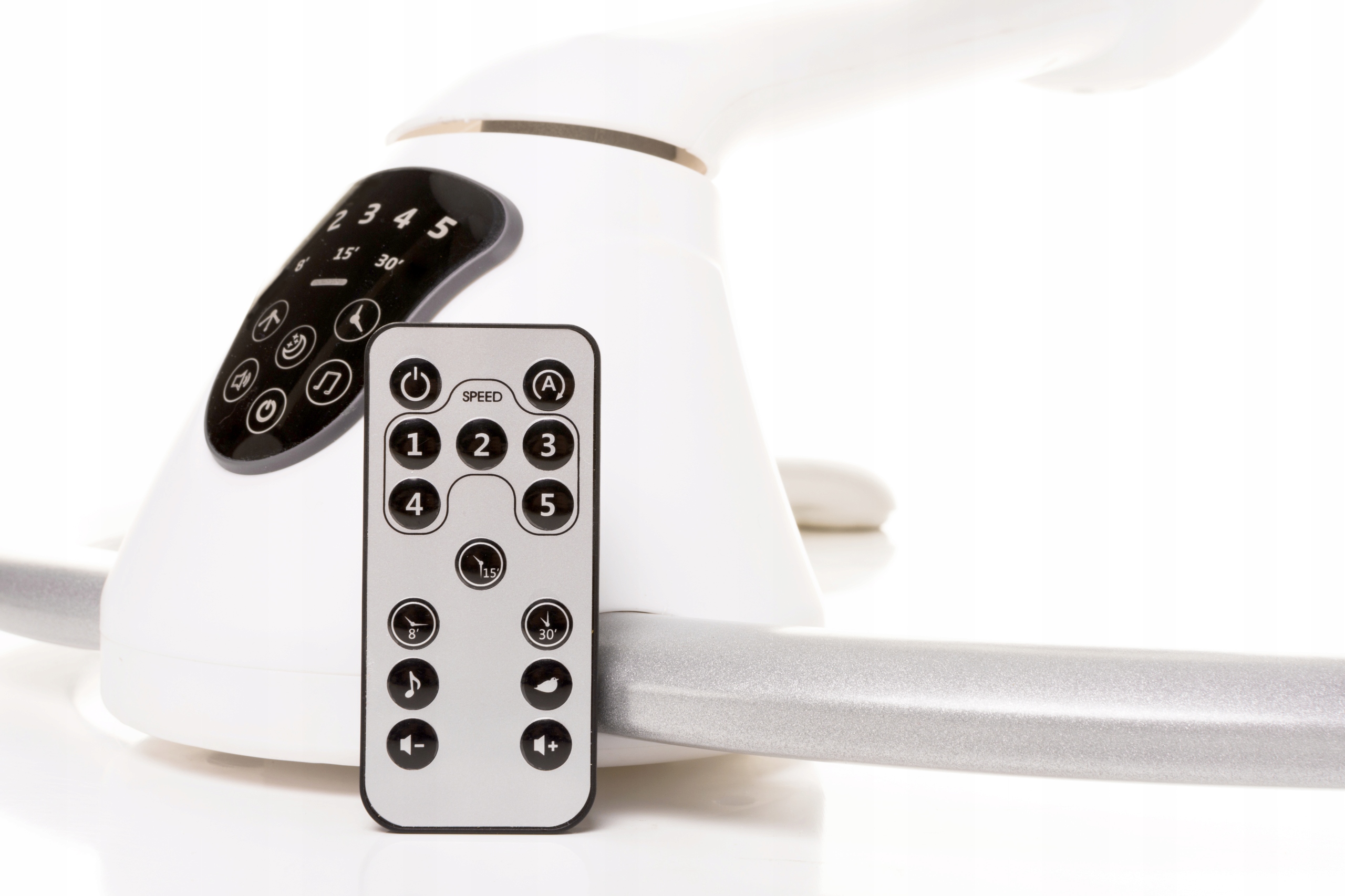 Механизм также имеет таймер, который автоматически выключает качание через 8, 15 или 30 минут. Благодаря созданному детектору движения, качели включатся в одиночку, как только она чувствует, что ребенок проснулся. Качание имеет элегантную, удобную и простой -использованную панель сенсорного управления, но также может работать с использованием беспроводного пульта дистанционного управления, включенного в набор.