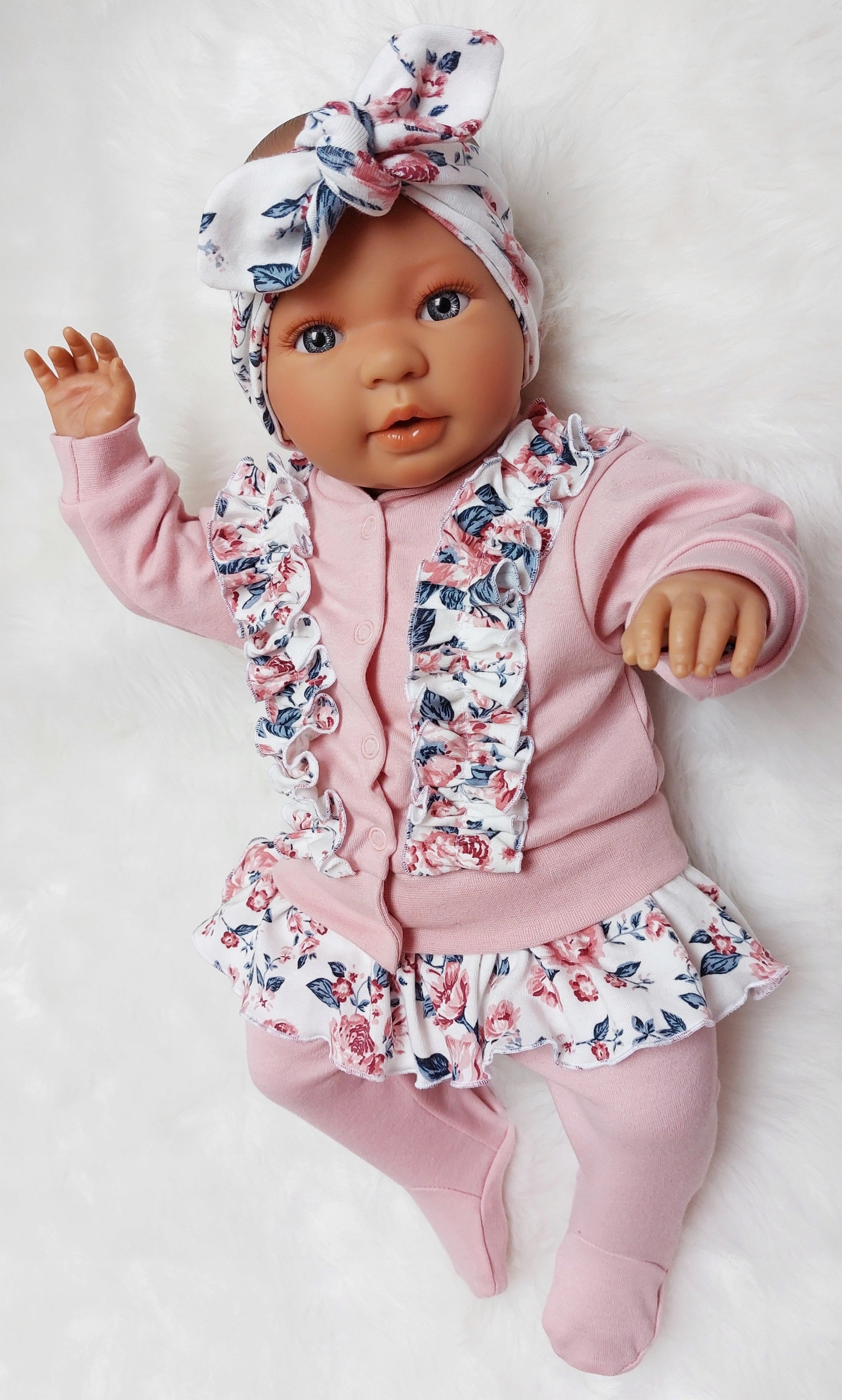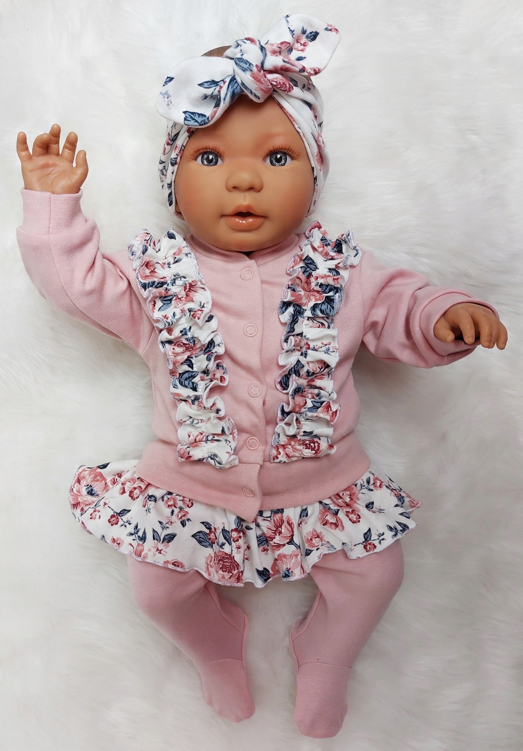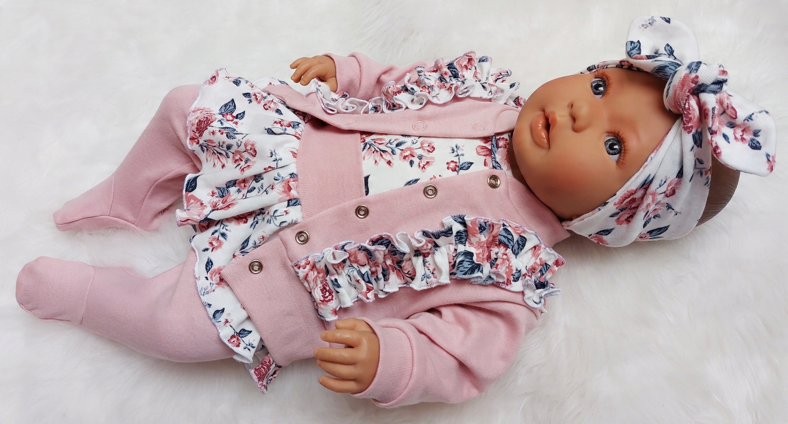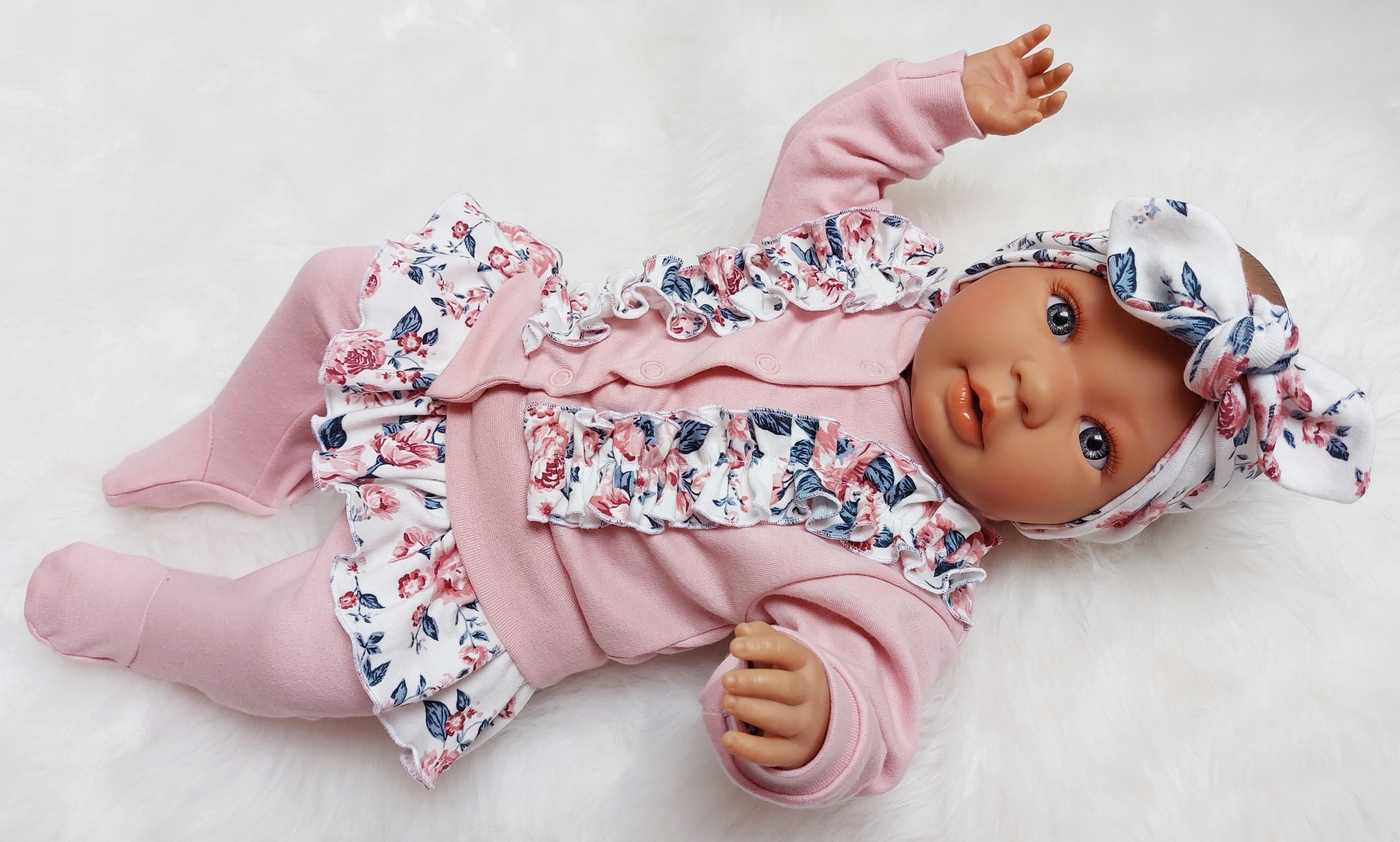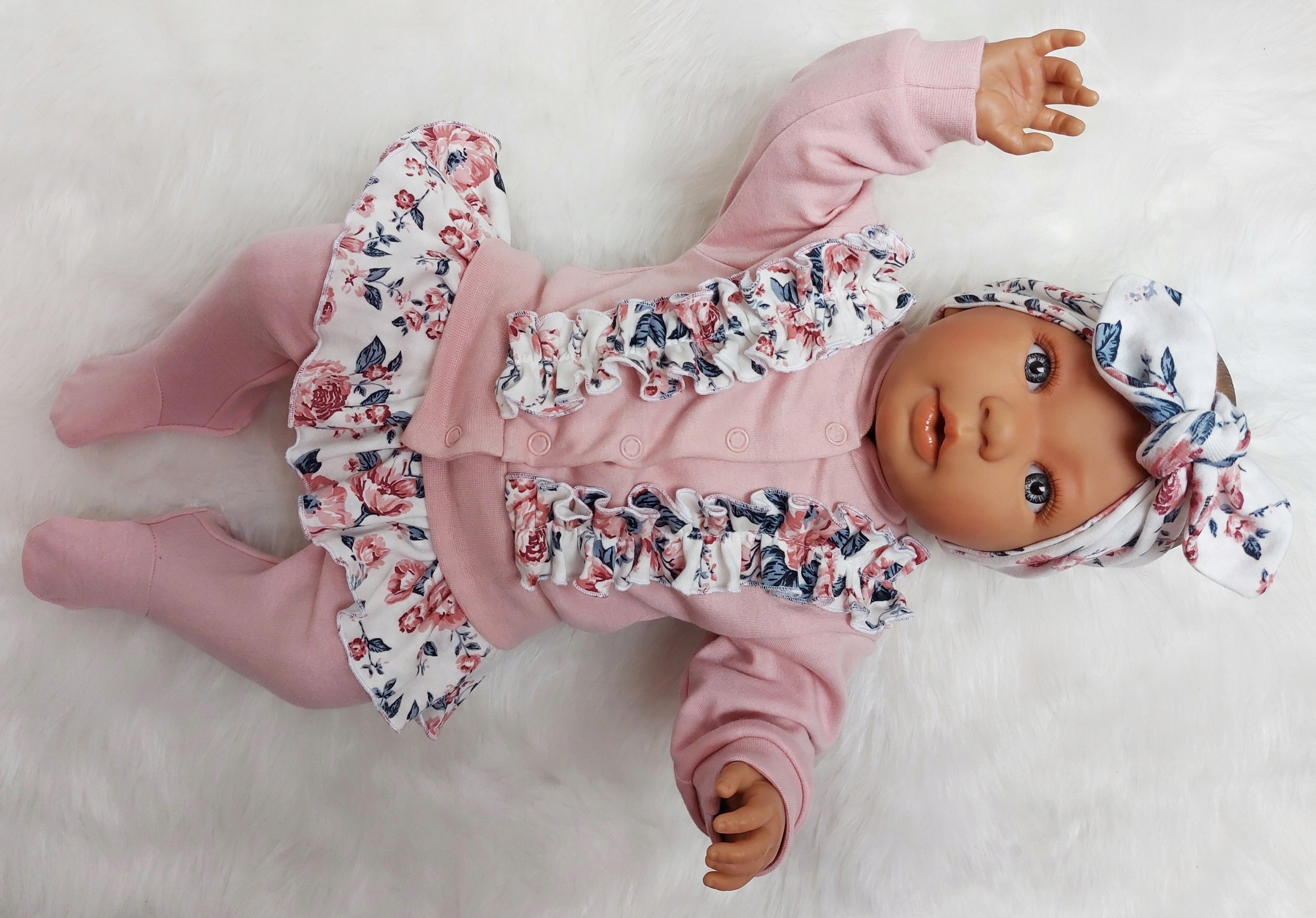 - боди - из хлопчатобумажной ткани кремового цвета (100% хлопок) с красивым цветком узором, застегивается на кнопки в промежности и на плече.
