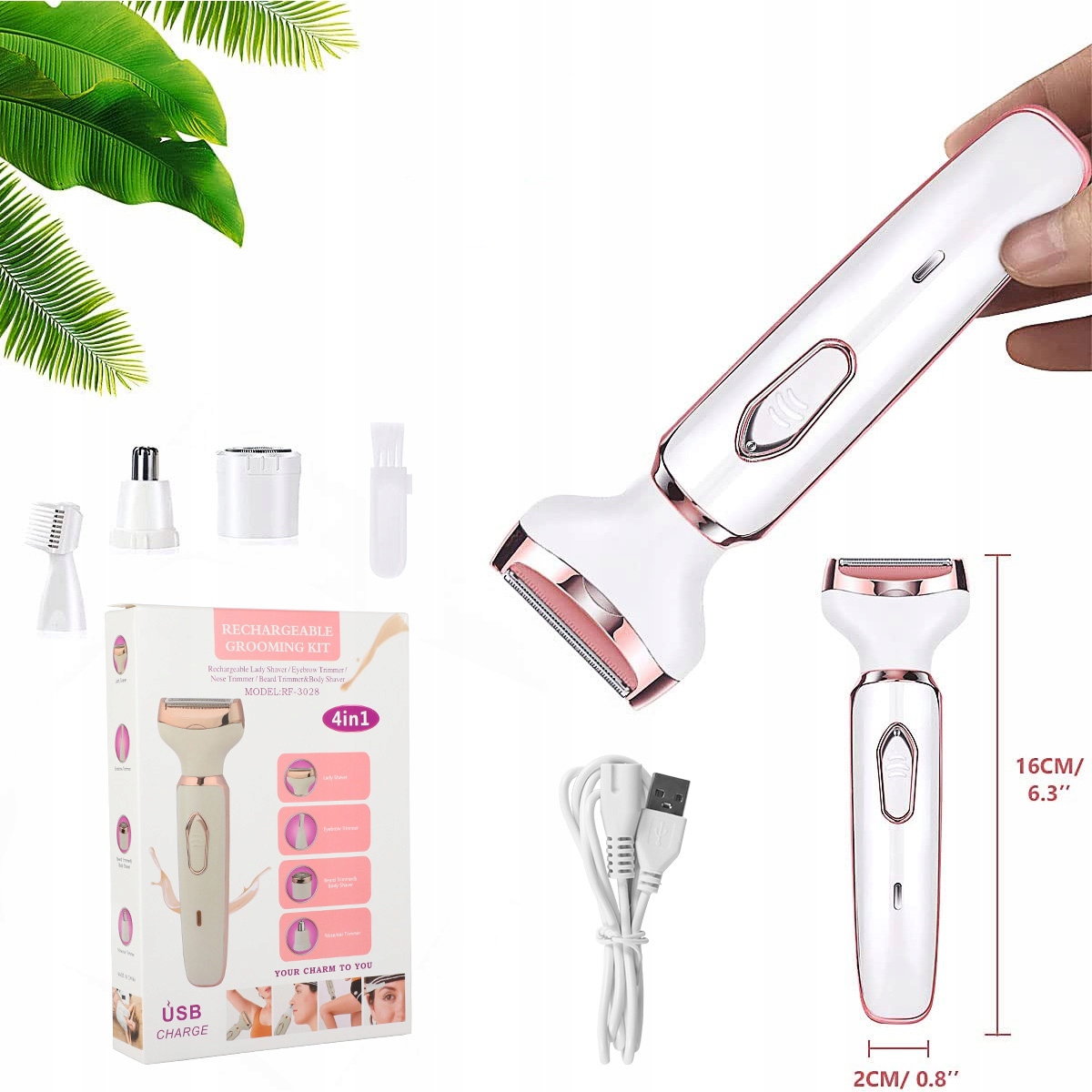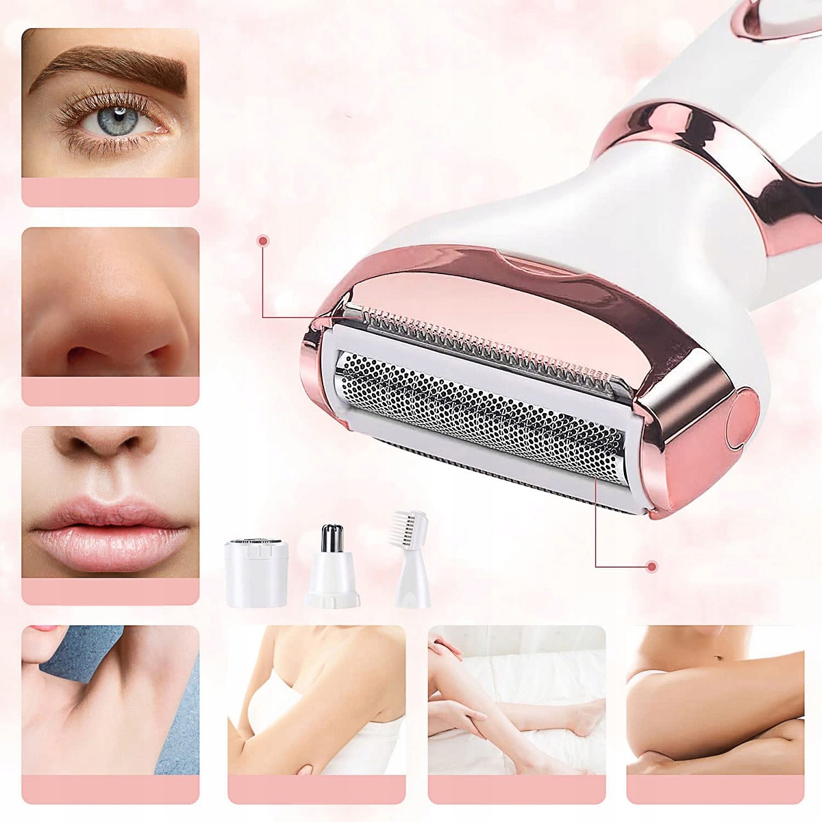 4 в 1 набор для бритья содержит 4 многофункциональных заменяемых головок для бритья, которые могут немедленно удалить волосы с лица, рук, ног, бикини, нос, бровей и другие части, благодаря тому, что кожа становится более гладкой, поэтому вам не нужно беспокоиться о превышении неприглядных волос. Бикини и триммер тела - лезвие находится близко к коже и не вызывает повреждения или раздражения кожи. Подходит для плеч, ног, подмышек, спины, тела и бикини, чтобы получить плавный эффект. Abular и Beard Trimmer - соответствующее защитное покрытие защищает лезвия и позволяет вам разрезать и формировать брови до необходимой длины, чтобы получить чистый и уверенный вид. Триммер лица и тела - подходящие для всех типов кожи и всех возрастов, гипоаллергенная лезвия из нержавеющей стали и защитная сетка, не вызывают покраснение и не раздражают кожу. Это достаточно деликатно для повседневного использования. Триммер носа и ушей - изготовленный из высококачественной нержавеющей стали, может эффективно и удобно удалить лишние волосы из носа и ушей. Строительство с одной кнопкой, простой в использовании, подходит как для мужчин, так и для женщин