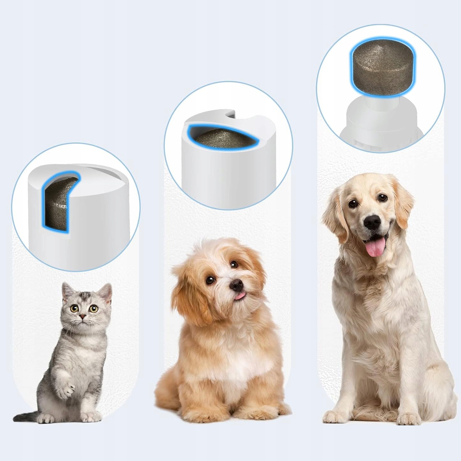 Когтя измельчитель оснащена 3 шлифовальными отверстиями, которые подходят для небольших, средних и крупных когтей животных. Просто поверните, чтобы выбрать лучший разъем для вашего питомца. Кроме того, наша шлифовальная машина использует передовую алмазную барабанную шлифовальную машину, которая делает измельчение когтей вашего питомца более удобным и безопасным, чем ногтевой нож.