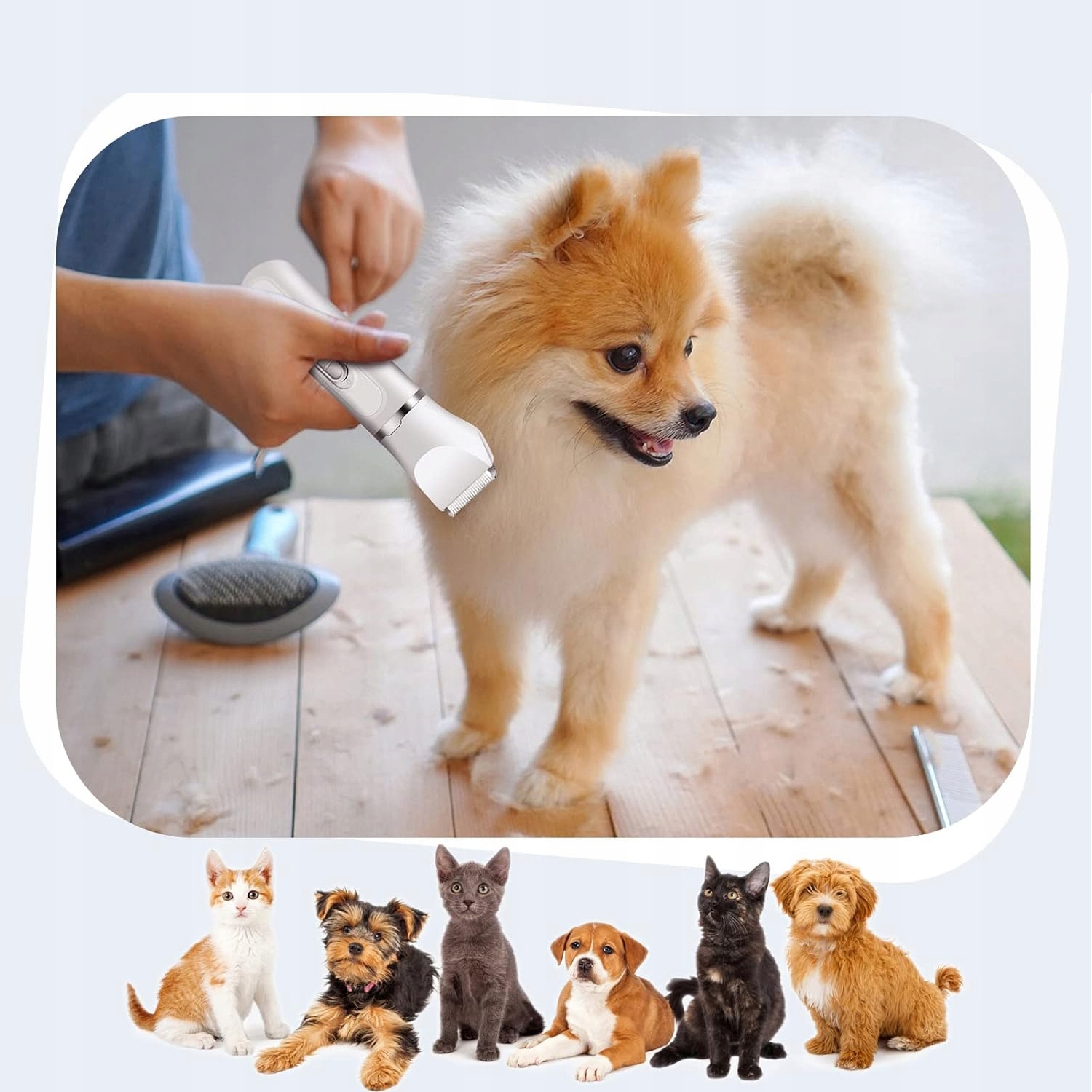 Два боя доступны для стандартного триммера для волос со стандартным размером. Заменяемый ведущий гребень может быть легко скорректирован, так что волосы животного на туловище, шеи и ногах не слишком длинные и не слишком короткие. Новичкам рекомендуется использовать ведущую расческу, чтобы процесс обрезки был безопасным.