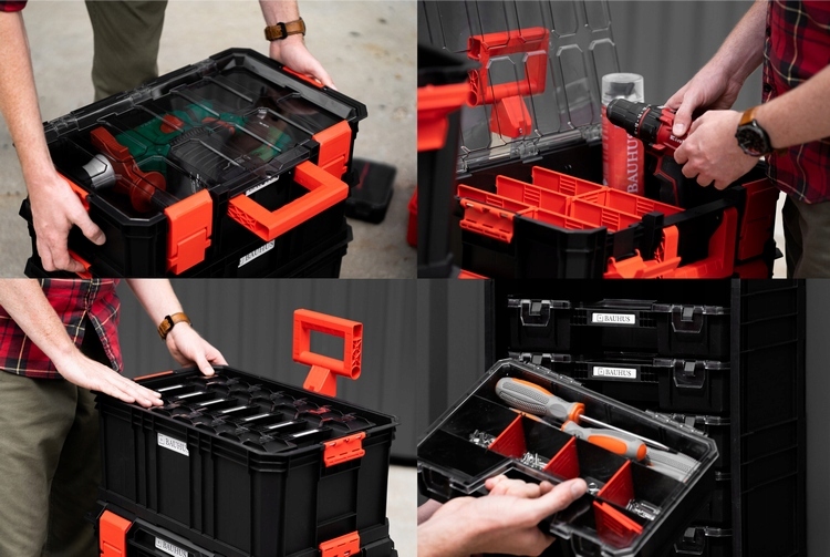 Бокс-набор Bauhus 4-в-1 — мобильный набор для хранения и транспортировки инструментов и аксессуаров. Набор ориентирован на людей, которые ценят функциональность, долговечность и закажите > в мастерской или на рабочем месте.