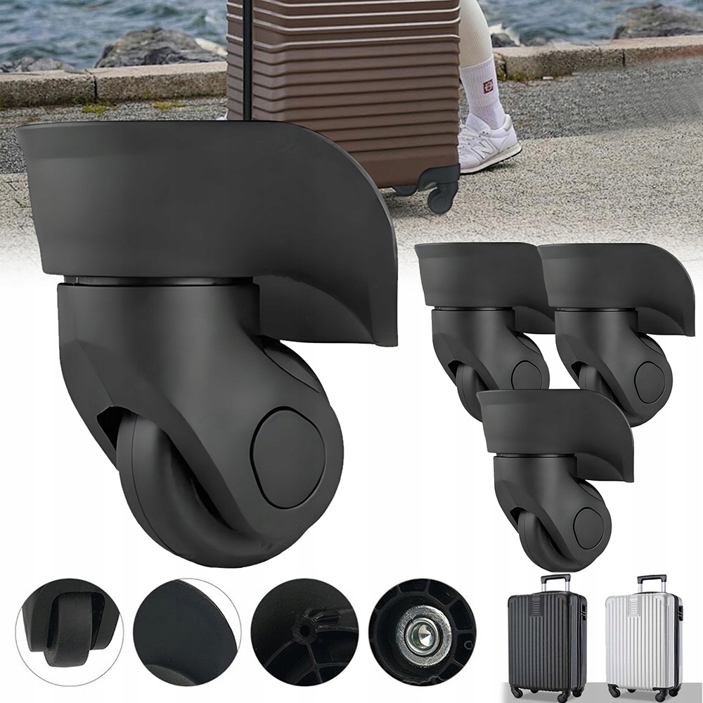 Запасное колесо допускает поворот под любым углом. Гибкая функция позволяет легко регулировать направление при езде по неровной местности. Колеса катятся очень плавно и не легко блокируются. Колесики для багажа имеют круглую форму с четырьмя отверстиями и идеально подходят для большинства чемоданов, что делает их практичными и идеальным дополнением к вашему багажу.