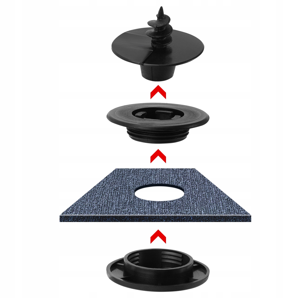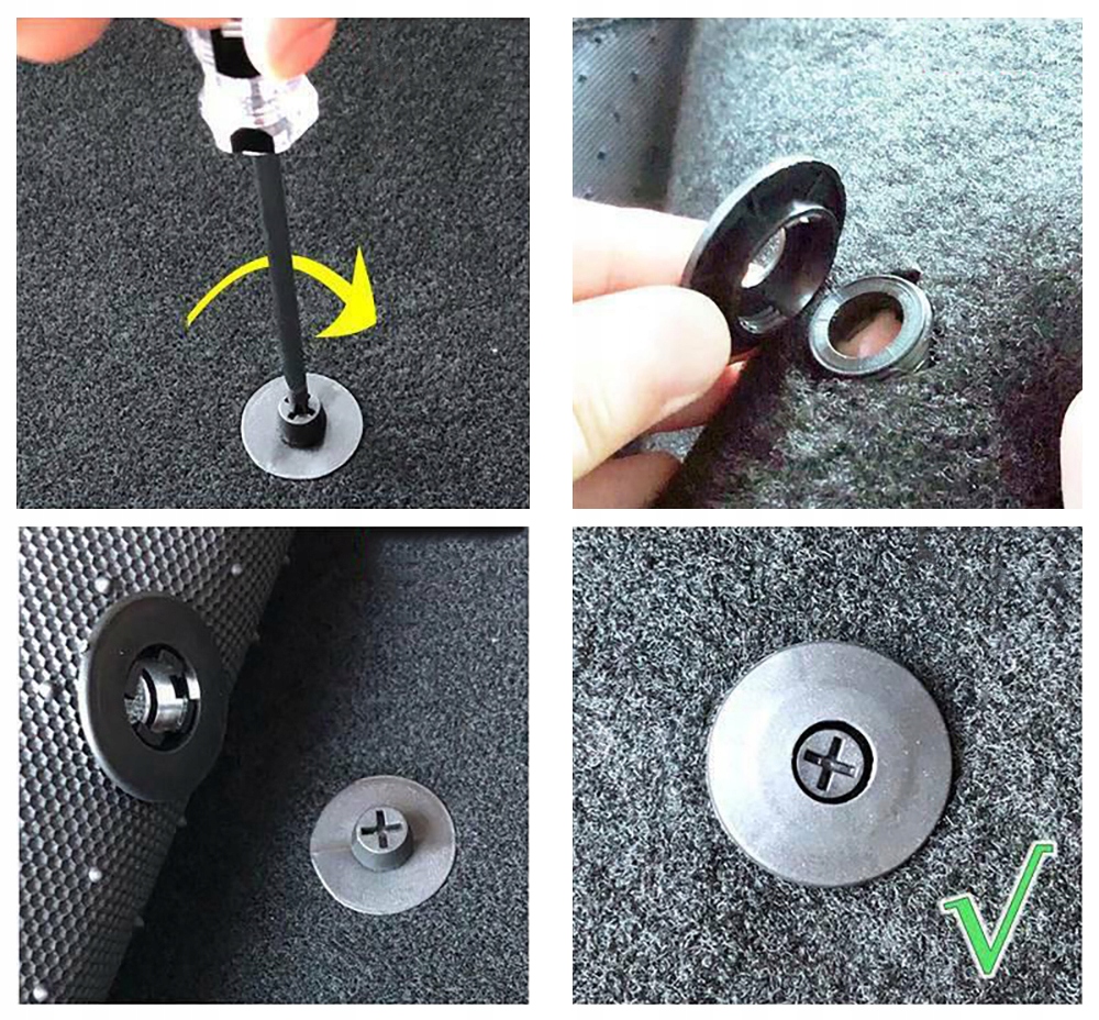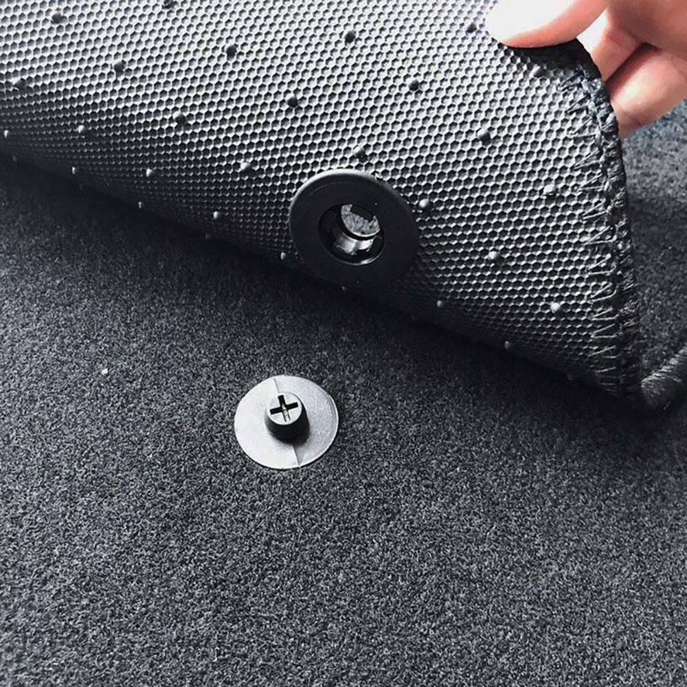 Стопоры автомобильного коврика состоят из двух основных частей. Первый — это клипсы, которые крепятся к коврику с обеих сторон. Вторая часть представляет собой зажим, ввинченный в обивку. Чтобы прикрепить коврик к зажиму для обивки, просто вставьте один зажим в другой. В этот момент коврик будет идеально прилегать к земле и предотвратит любые изгибы и опасные ситуации во время вождения.