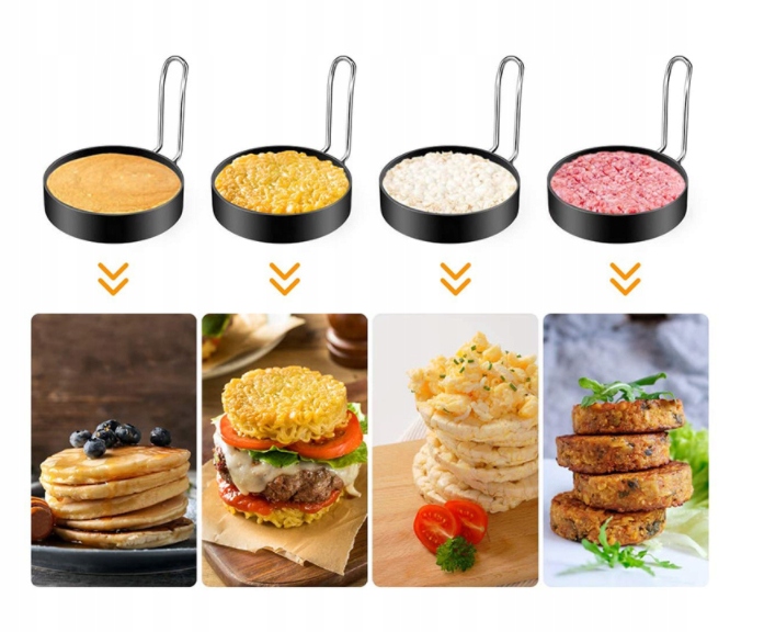 - Egg Ring позволяет регулировать гамбургеры, хлеб, фрукты, желе, яйца, омлеты, печенье, блины, бекон, картофель,