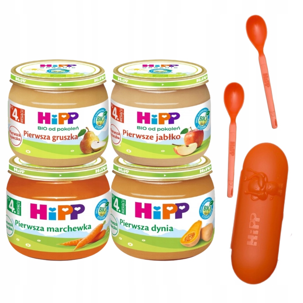 4x HiPP BIO Первая ложка, 80г + 2 чайные ложки в футляре - ОРАНЖЕВЫЙ цвет