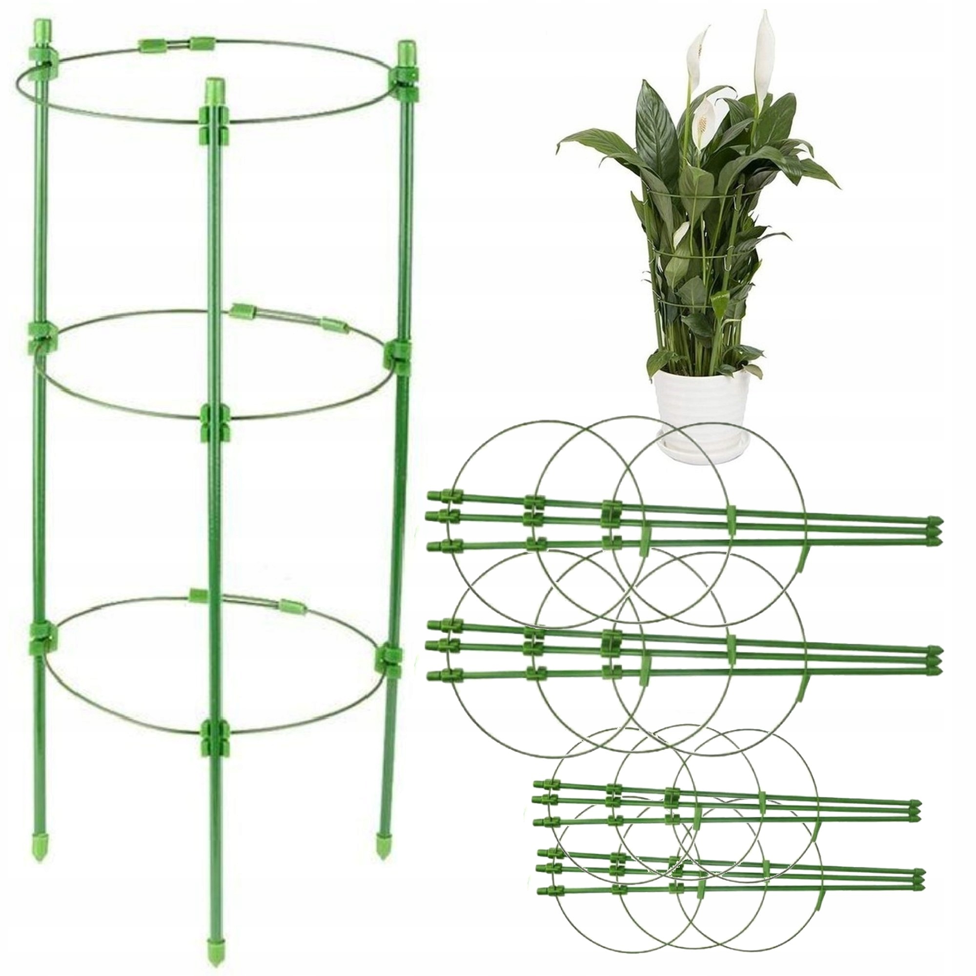 Набор кольцевых опор высотой 60 и 45 см, предназначенных для растений и цветов. Каждая опора оснащена тремя встроенными кольцами, которые поддерживают растение во время его роста.