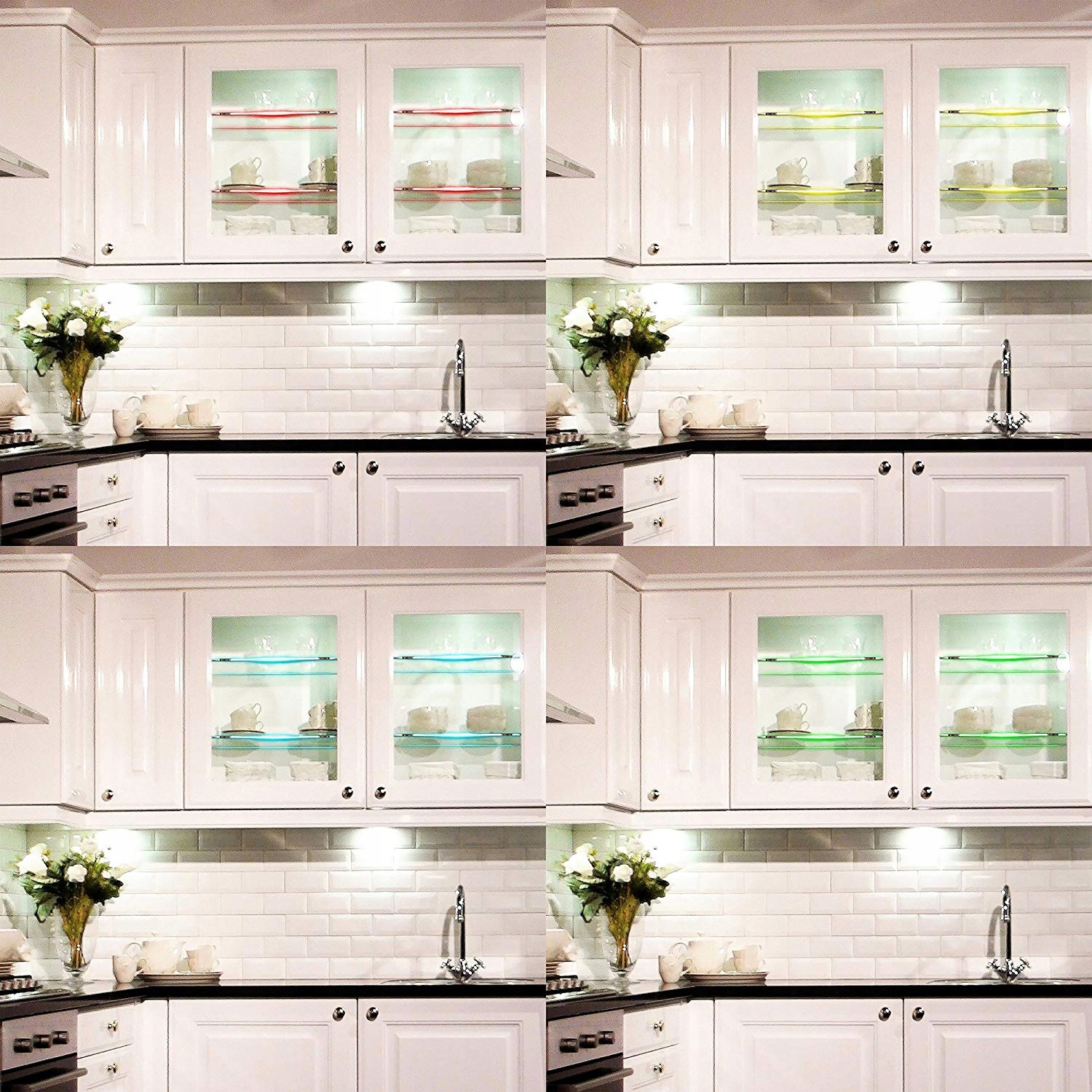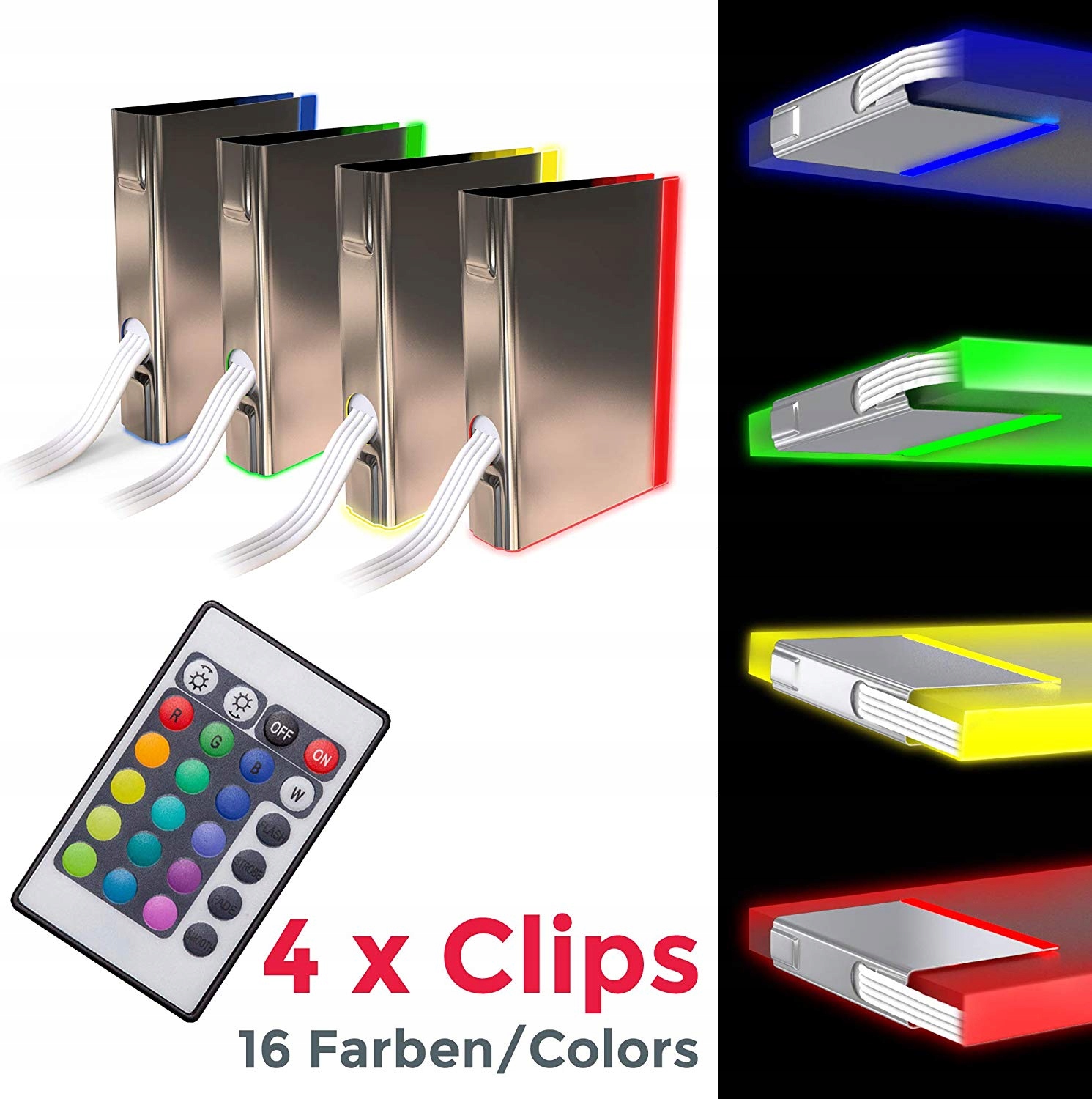 Набор из 4-х светодиодных клипс для освещения стеклянных полок - витрин, кухонных шкафов. Зажимы имеют 4 программы освещения, светятся 16 разными цветами и регулируются по яркости.
