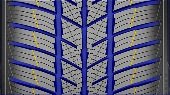 Оптимально расположенные блоки с поперечными вырезами в средних ребрах и плечах значительно улучшают сцепление со снегом. Особое расположение многофункциональных ламелей обеспечивает лучшее сцепление во всех направлениях при контакте с дорожным покрытием. Специальная конструкция профиля посередине улучшает боковое сцепление со снегом. Это обеспечивает исключительно хорошее сцепление с дорогой, короткий тормозной путь и безопасное движение по заснеженным дорогам.