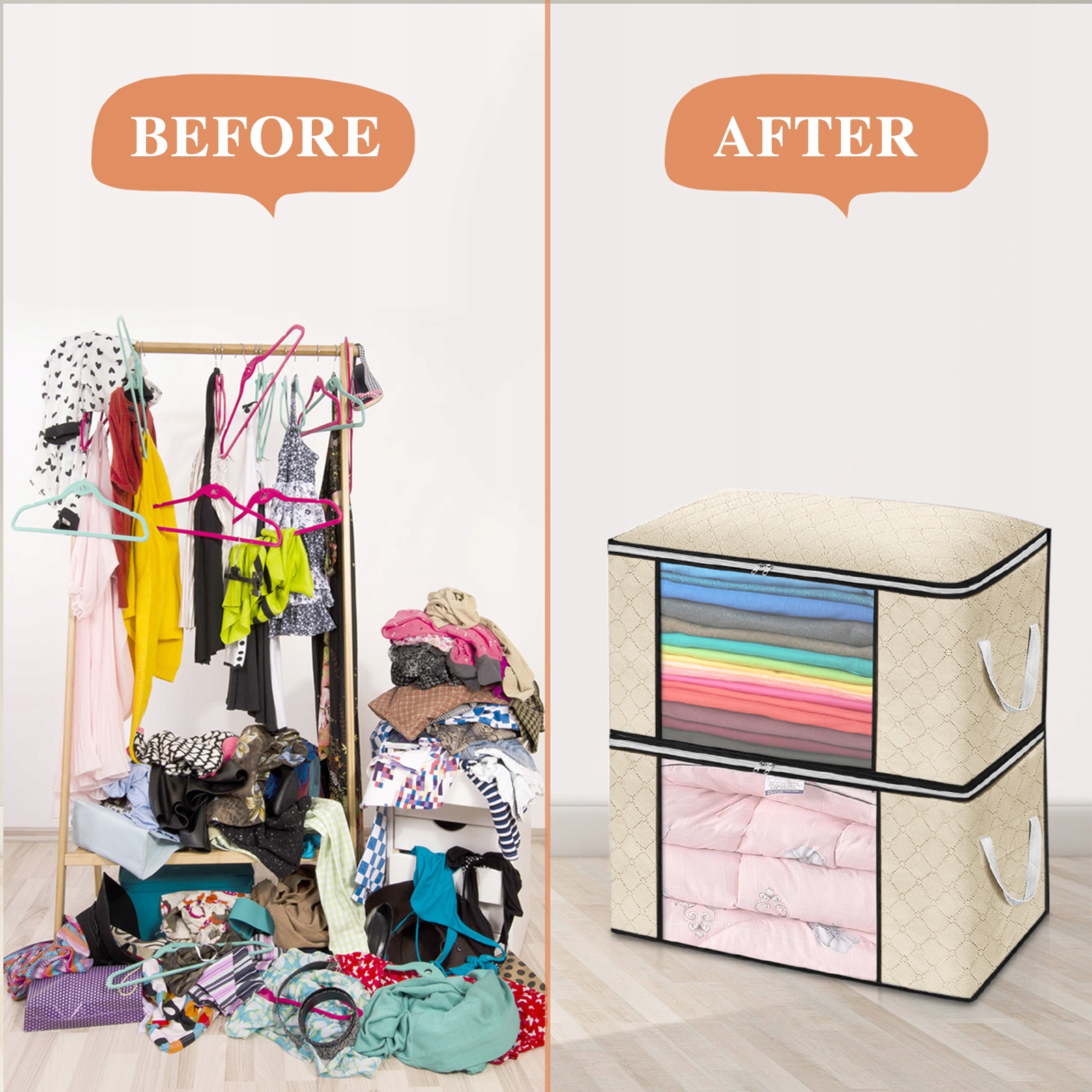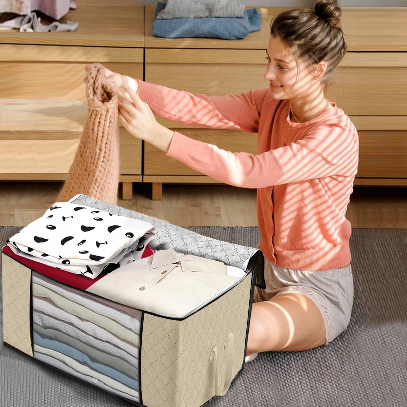 【УЛУЧШЕННЫЙ, ПРОЧНЫЙ МАТЕРИАЛ】 Наш органайзер для одежды изготовлен из высококачественного трехслойного композитного нетканого материала без запаха, который обеспечивает вентиляцию и защищает хранимые предметы. Мы предоставляем 4 упаковки больших беспыльных мешков для хранения одежды в одном наборе, поэтому лучше взять эти большие мешки домой для одежды, одеял, одеял и подушек для хранения постельного белья.