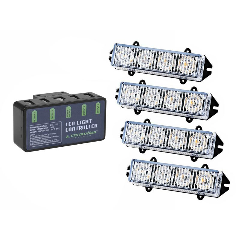 Профессиональный набор из 4 светодиодных стробоскопических ламп постоянного тока 12 В. Комплект подсвечивается оранжевым светом, множество световых программ можно выбрать с помощью контроллера, водонепроницаемые стробоскопические фонари. Набор мощностью 16 Вт (4 x 4 светодиода).