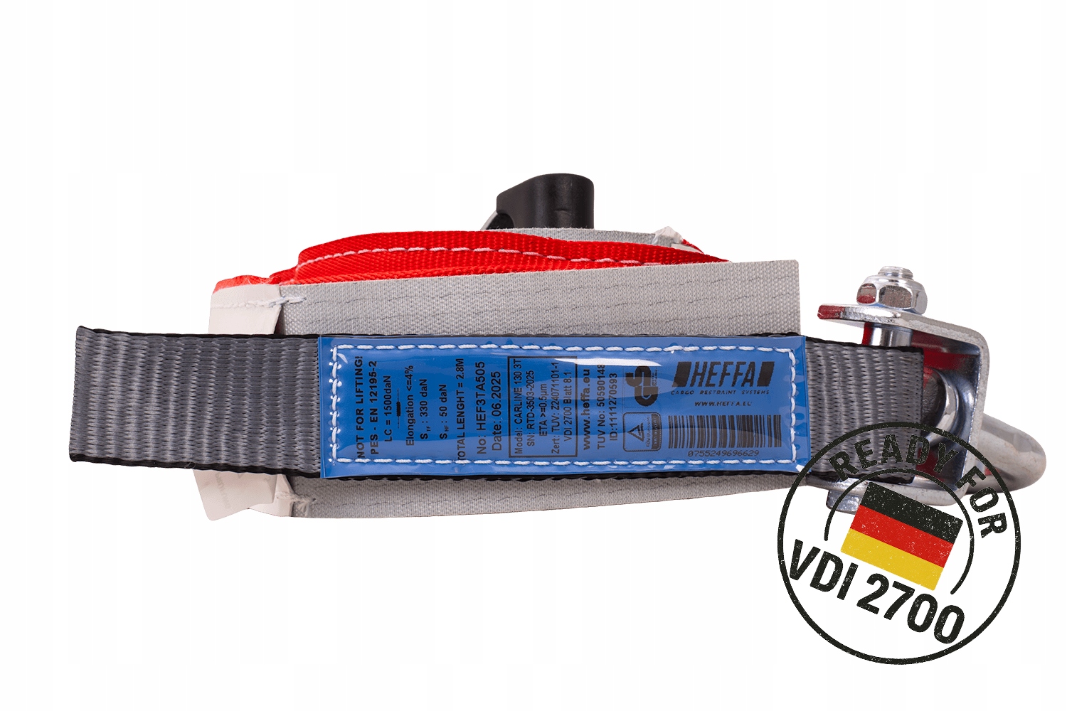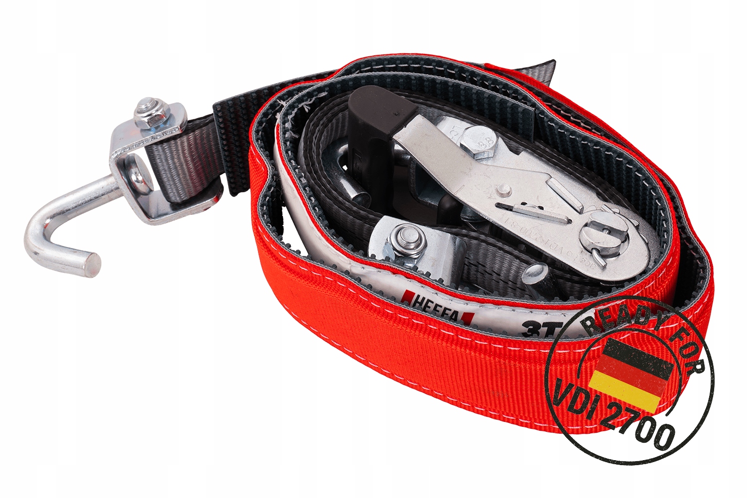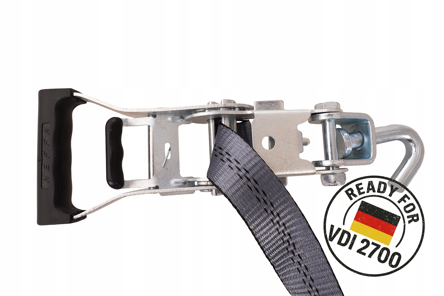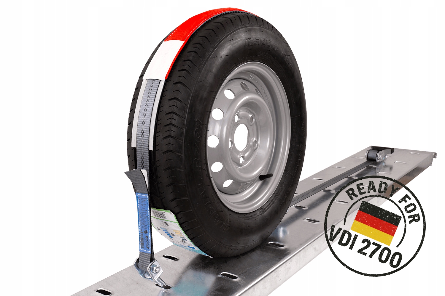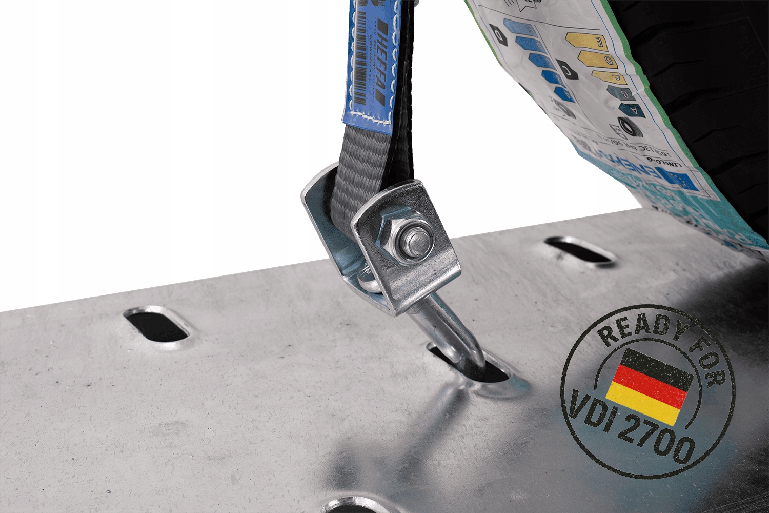 Директива VDI 2700 часть 8.1 — немецкий технический стандарт, устанавливающий подробные требования к креплению транспортных средств, перевозимых на прицепах и прицепах. Что касается крепления ремней колесными ремнями, эта директива, среди прочего, определяет способ крепления ремней, необходимое количество точек крепления (например, трехточечная система), минимальные параметры натяжения, а также правила их маркировки и технические разрешения. Соответствие VDI 2700 8.1 означает, что ремни отвечают строгим требованиям с точки зрения безопасности, надежности и эффективности обездвиживания транспортируемого транспортного средства, что имеет решающее значение для профессиональной перевозки легковых автомобилей и грузовых фургонов. Благодаря этому пользователь может быть уверен, что используемая система крепления соответствует действующим европейским и немецким стандартам в области безопасности дорожного движения.