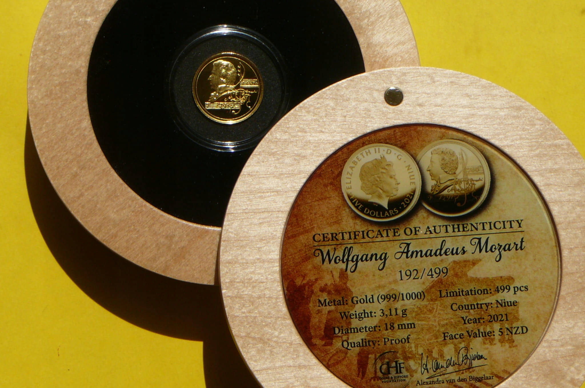 НА АУКЦИОНЕ ПРЕДСТАВЛЯЕТСЯ КРАСИВАЯ ОРИГИНАЛЬНАЯ И ОЧЕНЬ РЕДКАЯ КОЛЛЕКЦИОННАЯ ИНВЕСТИЦИОННАЯ ЗОЛОТАЯ МОНЕТА - 5 ДОЛЛАРОВ - НИУЭ 2021 ГОДА - ВОЛЬФГАНГ АМАДЕУС МОЦАРТ - ЧИСТОЕ ЗОЛОТО 999 пробы - МОНЕТНЫЙ ФОНД - ЗЕРКАЛО МАРКИ - РЕДКОСТЬ - ОЧЕНЬ РЕДКОЕ - ИЗДАНИЕ ВСЕГО 499 ШТУК!! + СЕРТИФИКАТ ПОДЛИННОСТИ № 192 + ОРИГИНАЛЬНЫЙ ДЕРЕВЯННЫЙ Футляр -МОНЕТЫ ЭТОЙ СЕРИИ ПРЕДЛАГАЮ НА ДРУГИХ АУКЦИОНАХ - ПОЖАЛУЙСТА, ПРОВЕРЬТЕ АУКЦИОН