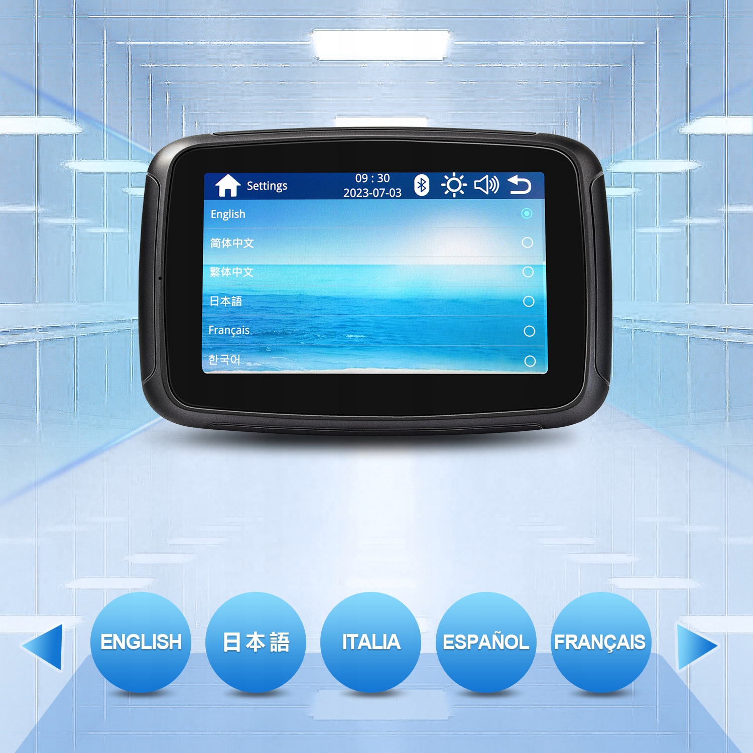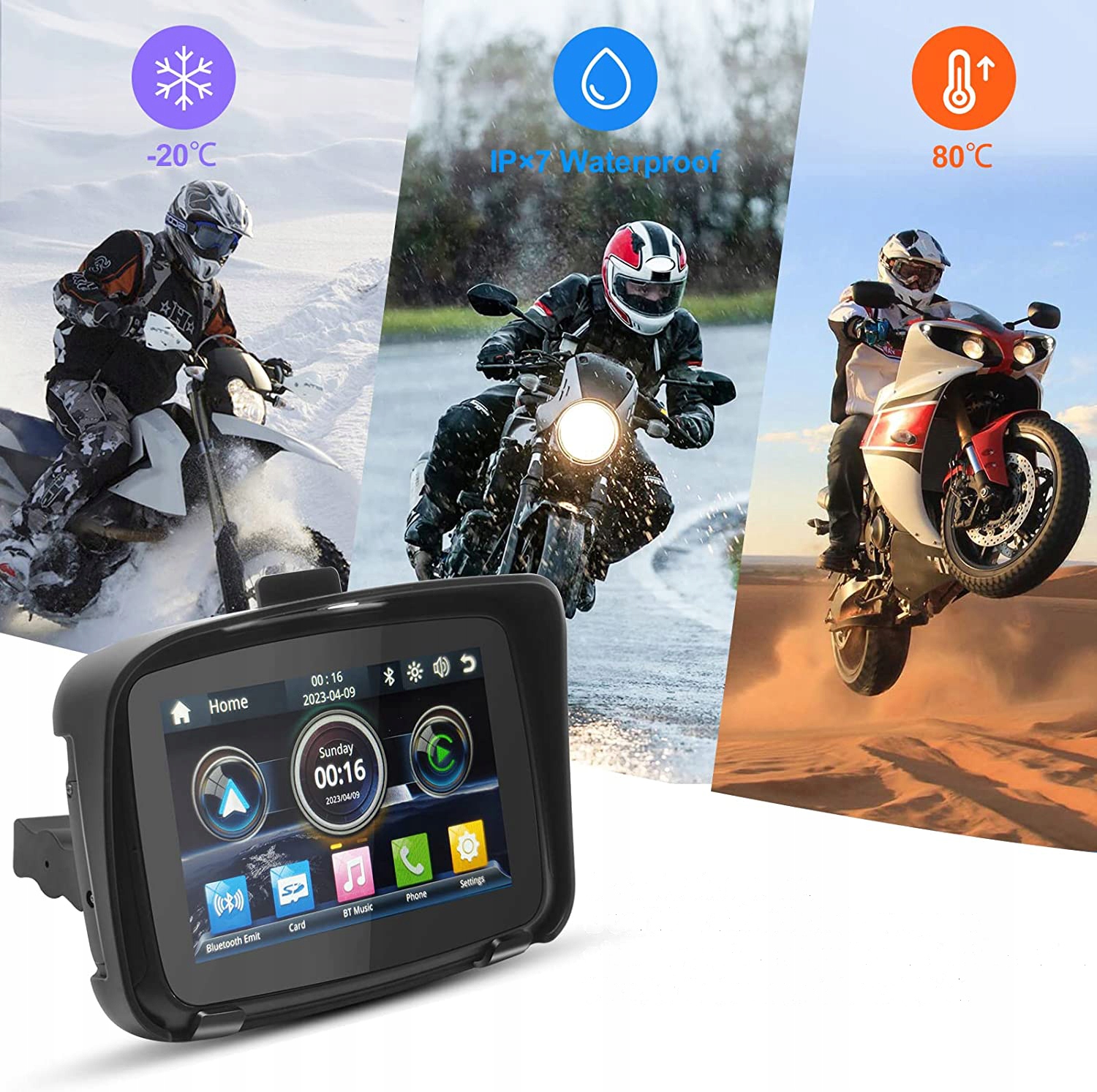 5-дюймовый антибликовый сенсорный экран: Это мотоциклетное GPS-навигационное устройство оснащено 5-дюймовым сенсорным экраном, читаемым даже при солнечном свете, с разрешением 800 x 480, что позволяет лучше видеть состояние дороги. Яркий и сохраненный. Подходит для всех мотоциклов с напряжением 12 В.