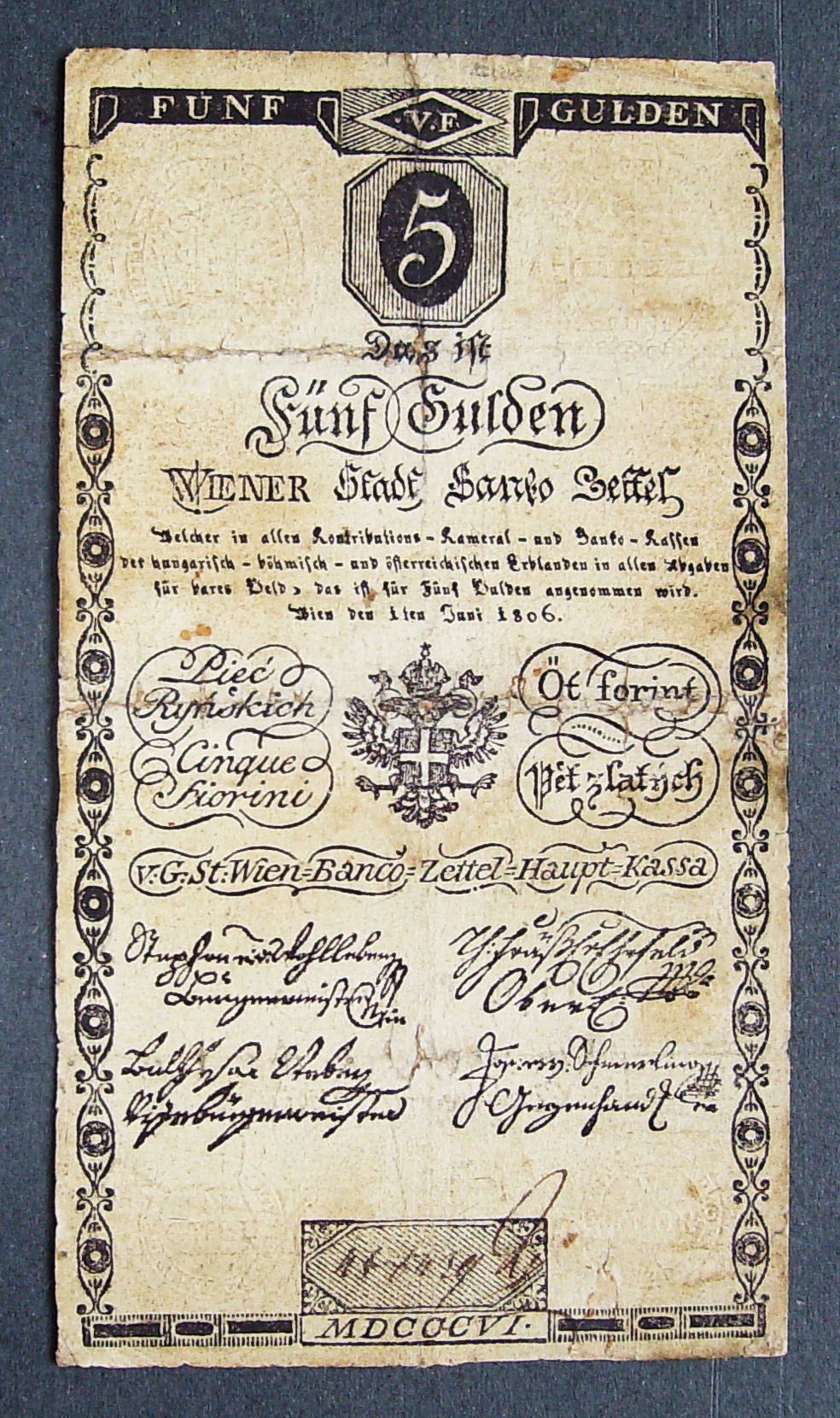 5 гульденов (Пять Рыньских) 1806 г.. На фото банкнота после консервации. Пожалуйста, оплатите в течение 10 дней, за границу не продаю.