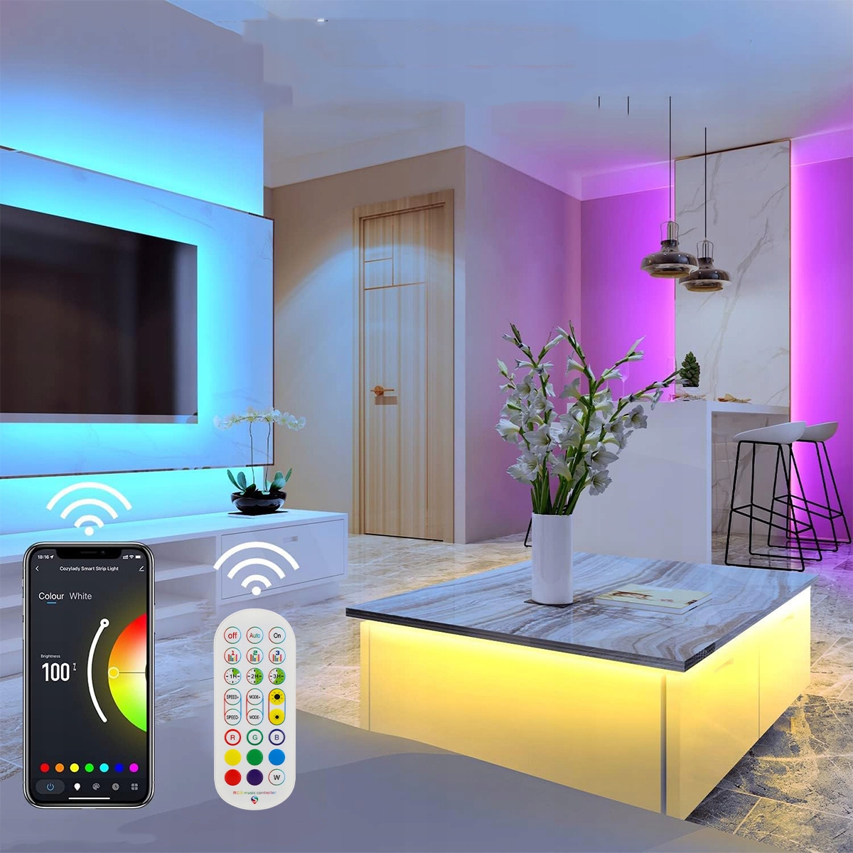 【Интеллектуальное управление применением и голосовым управлением】 После успешного сочетания осветительной полосы с помощью Wi-Fi (только Wi-Fi 2.4g, Wi-Fi 5G не поддерживается) Вы можете использовать «умную жизнь» или голосовое приложение (Amazon Alexa Alexa / Google Home Assistant), чтобы контролировать цвет, яркость и скорость освещения световой полосы, создавая репутацию атмосфера. Примечание: нота: нота: нота. бегущего света). Благодаря 16 миллионам цветов на выбор ваши руки получат истинную свободу, и жизнь станет богаче.