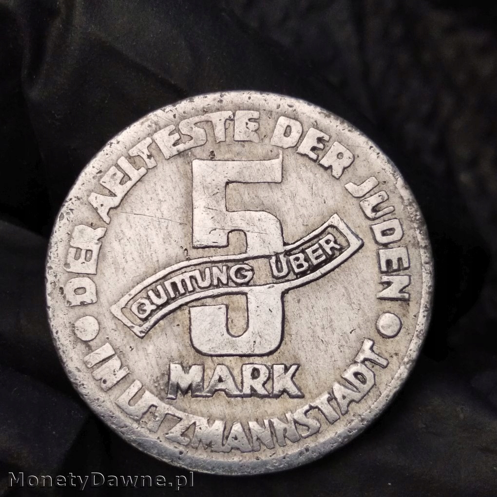5 Марек 1943, гетто в Лодзи; Хорошее, распространенное поведение, слегка блестящее. Алюминий, вес: 1,57 г.