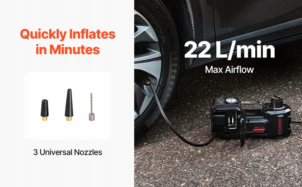 Быстрая накачка шин: встроенный воздушный компрессор оснащен 3 стандартными форсунками, позволяющими накачивать шины за считанные минуты и мгновенно возвращать вас на дорогу.