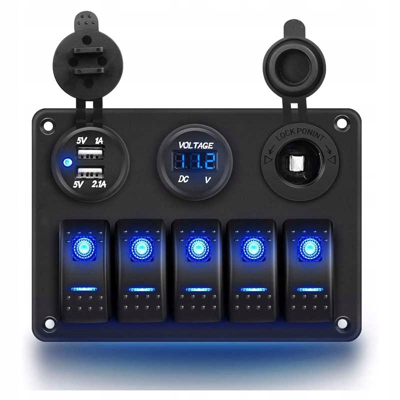 Щит распределительный для лодок, с USB-розетками и вольтметром. Он имеет 5 цепей с выключателями и синей подсветкой.