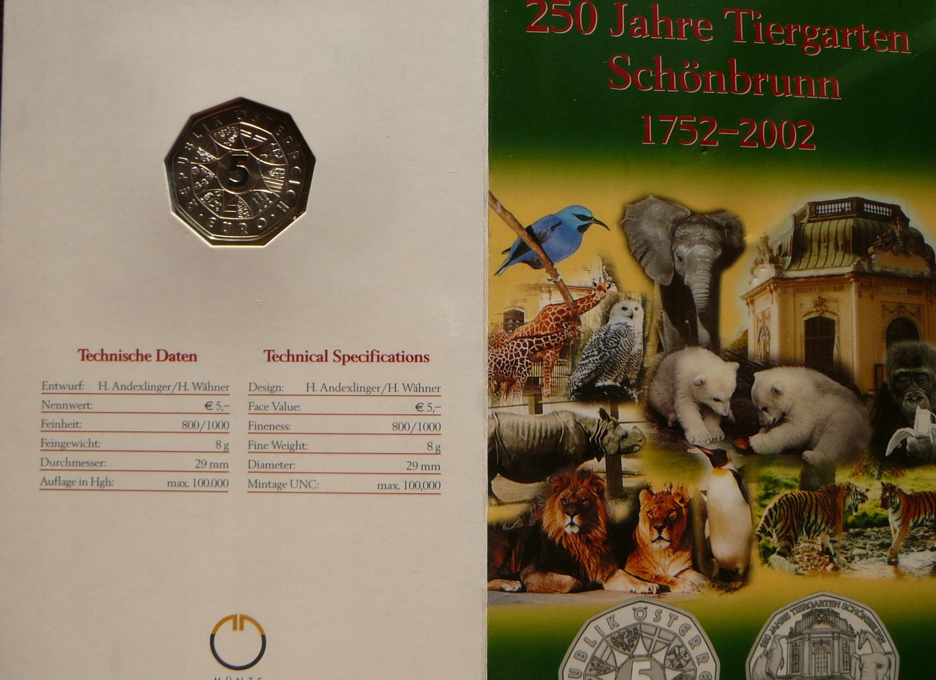 5 ЄВРО АВСТРІЯ 2002 ВІДЕНСЬКИЙ ЗООПАРК ЛЕВ СЛОН МАВПА СОВА