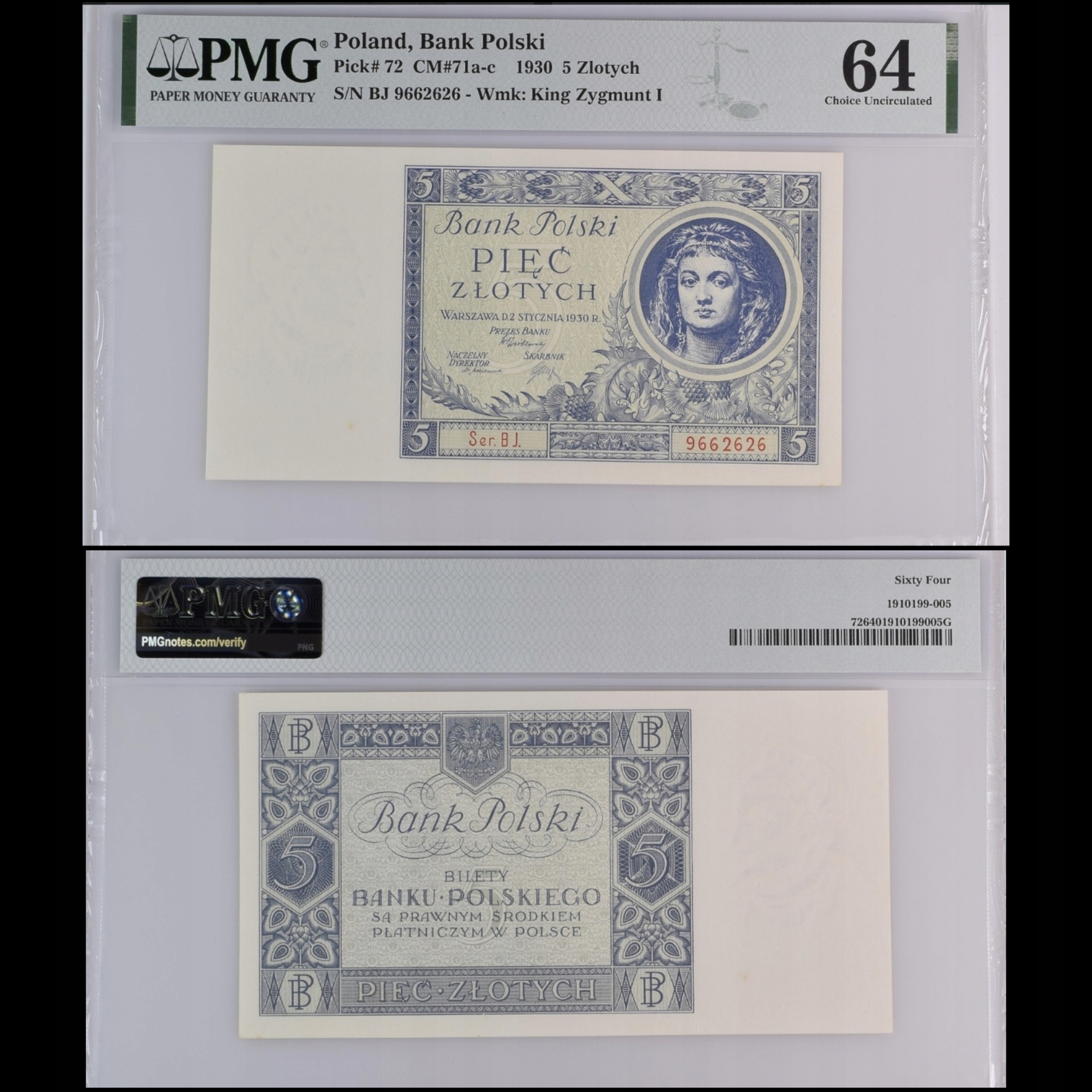 Просматривая «5 Zlotys 1930 PMG 64» данный товар из каталога «1919 - 1939 золотые», вы можете получить дополнительную скидку 4%, если произведете 100% предоплату. Размер скидки вы можете увидеть сразу при оформлении заказа на сайте. Внимание!!! Скидка распространяется только при заказе через сайт.