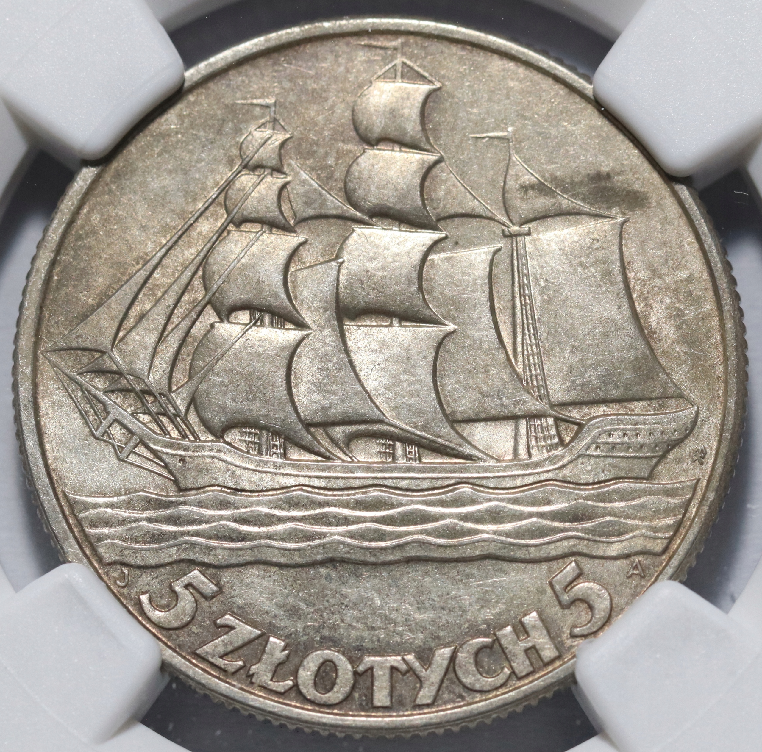 5 Zlotys 1936 NGC MS 61 Парусное судно