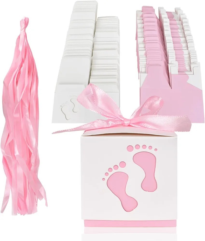 Квадратные бумажные коробки с маленькими детскими ножками, украшенные лентой.