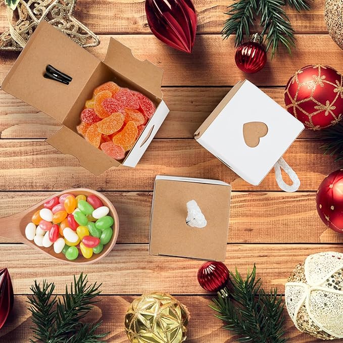 Коробка конфет размером 5,5 х 5,5 х 5,5 см в белом и коричневом цвете. На каждой стороне имеется узор в форме сердца, что означает полное любви, элегантности, ретро-стиля и красоты. Она подойдет к любому свадебному столу, что сделает ваш подарок еще более изысканным.