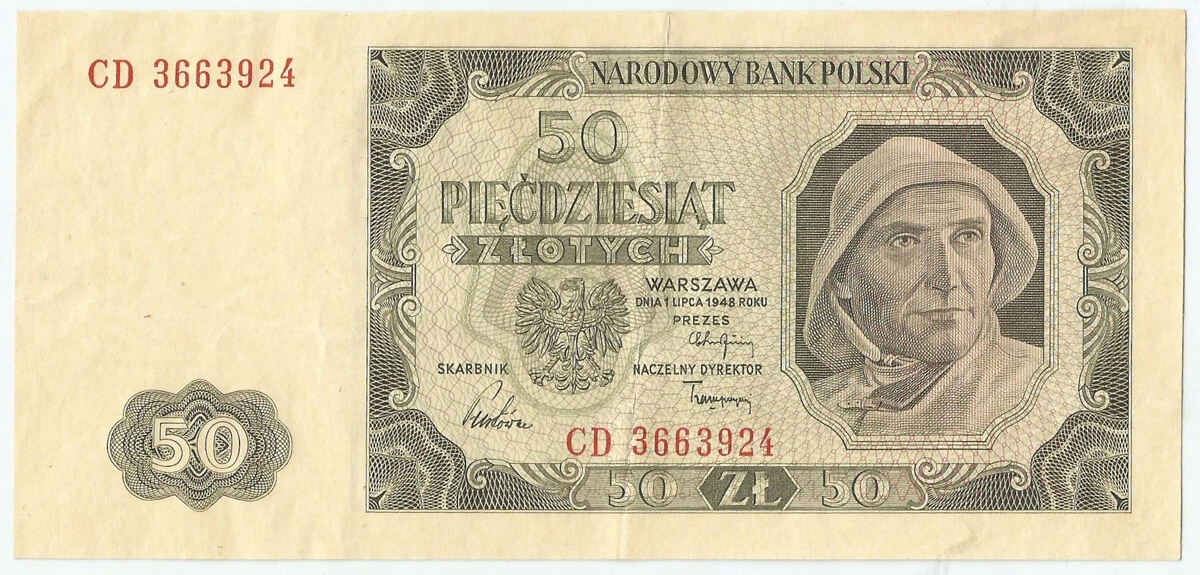 50 злотых, 1948 г., состояние 3/3+, серия CD.