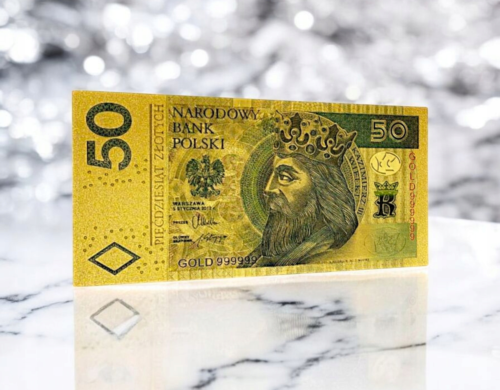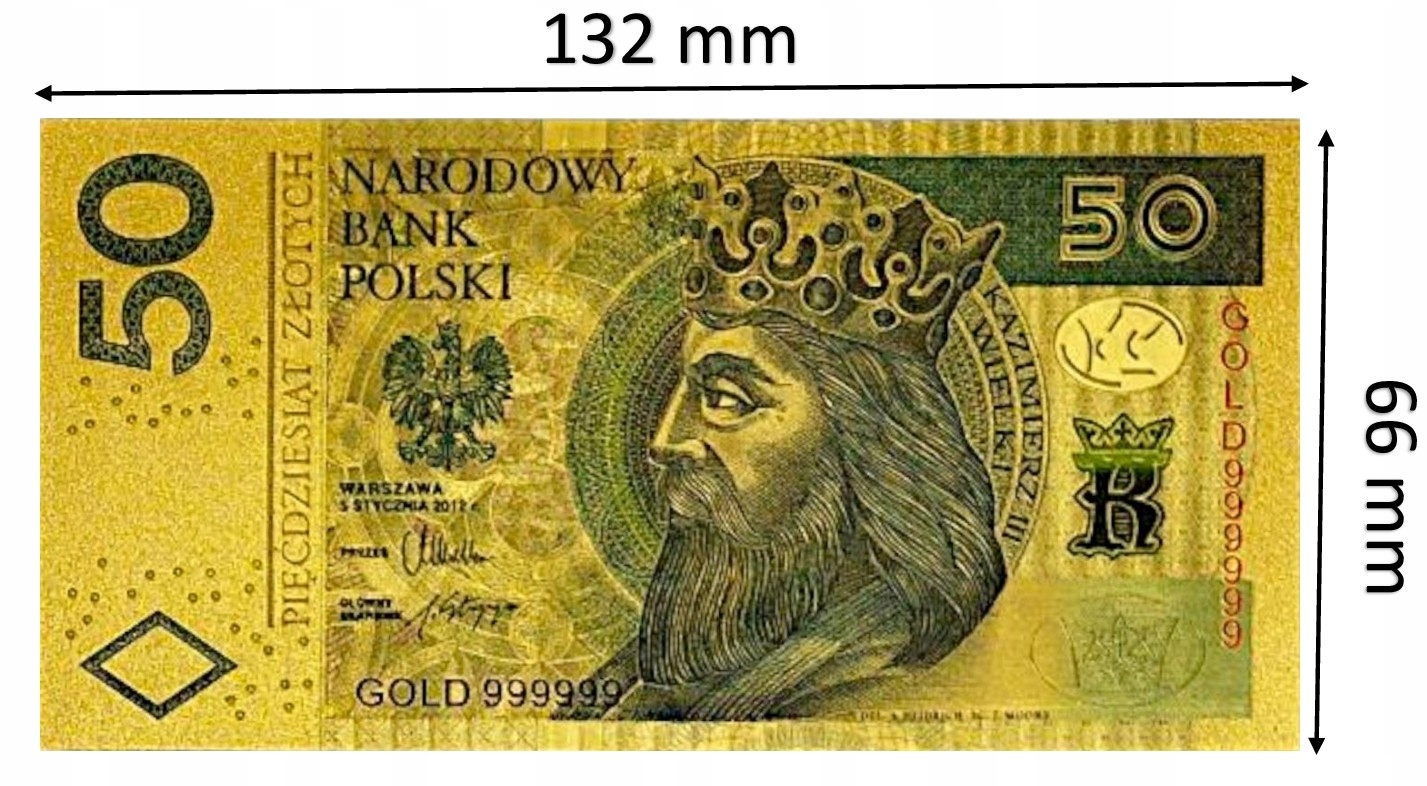 прекрасная копия банкноты польской циркуляции с этой деноминацией из ПВХ и покрытой золотой пленкой.