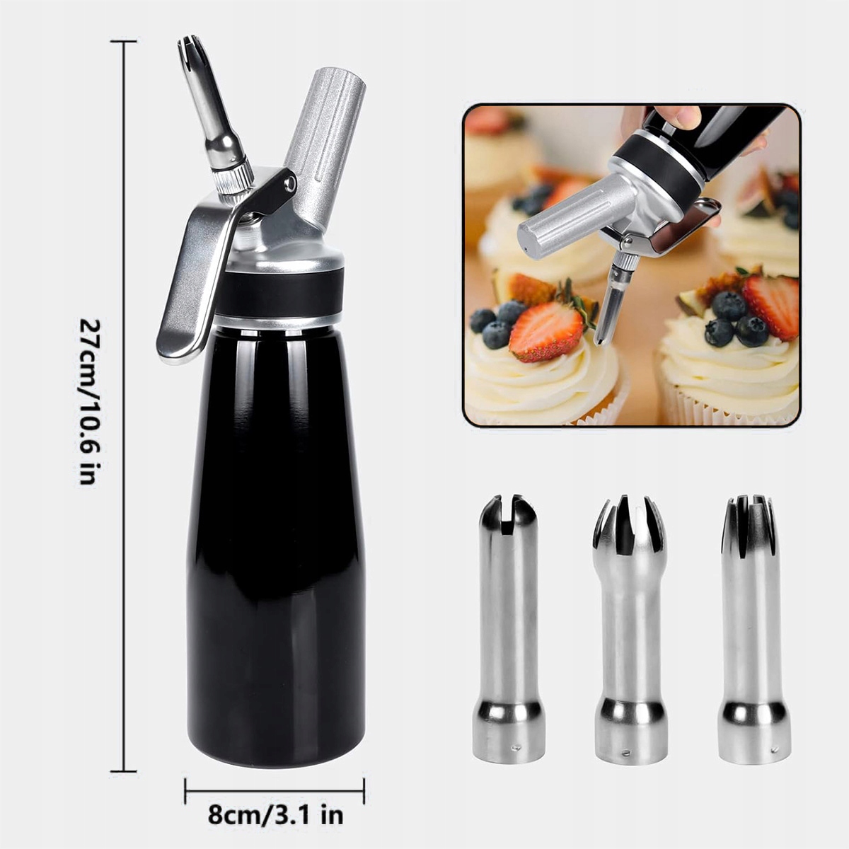 🎂 Горячее и холодное: алюминиевая головка и корпус, как а наконечники из нержавеющей стали делают сифон пригодным как для приготовления холодных, так и для горячих кремов.