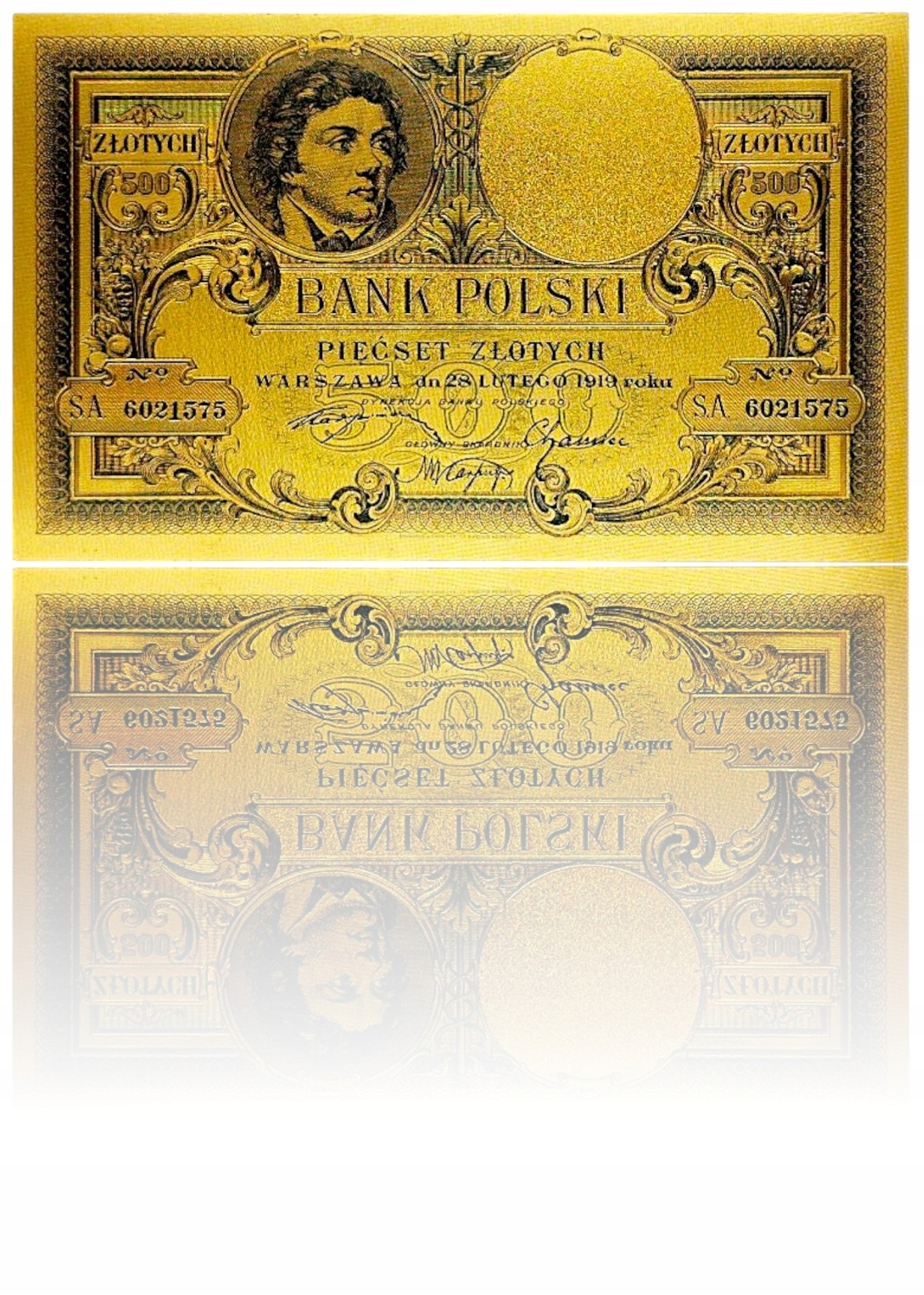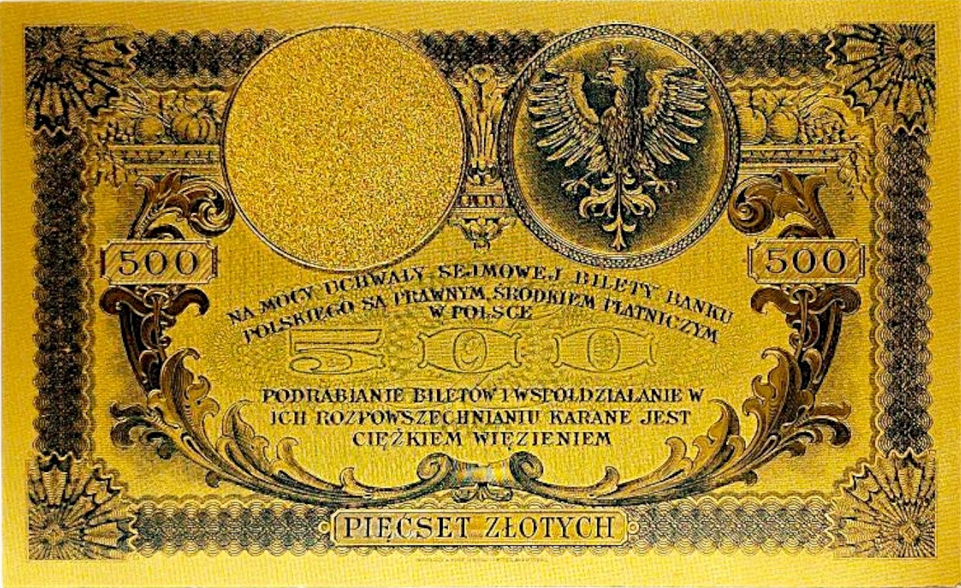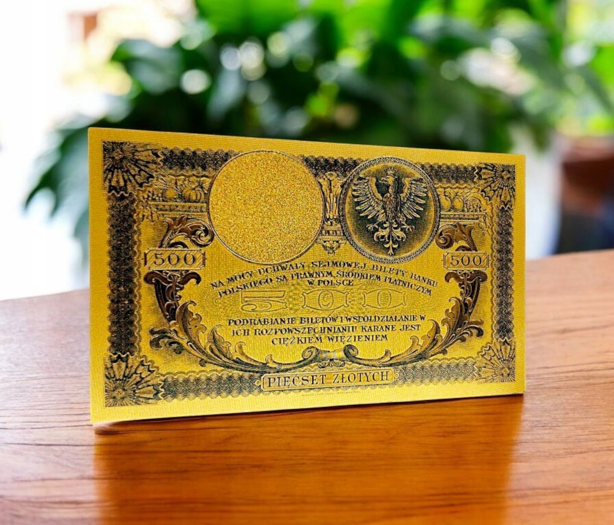 КОЛЛЕКЦИОННАЯ БАНКНОТА 500 ЗЛЫХ 1919 ГОДА, ПОЗОЛОЧЕННАЯ КОЛЛЕКЦИОННАЯ БАНКНОТА ИЗ ПВХ