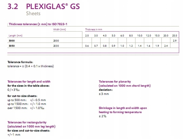 Поскольку он отлит из оргстекла, его толщина не является постоянной, как у экструдированного оргстекла - примеры допусков приведены ниже.