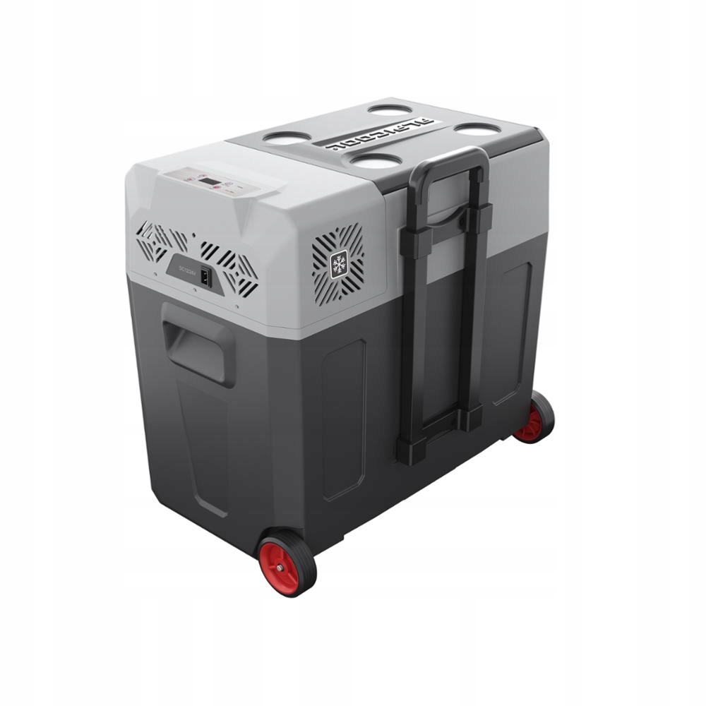 Туристический холодильник V50 оснащен транспортировочными колесами, съемной ручкой и двумя колодцами. -размещены боковые ручки.
