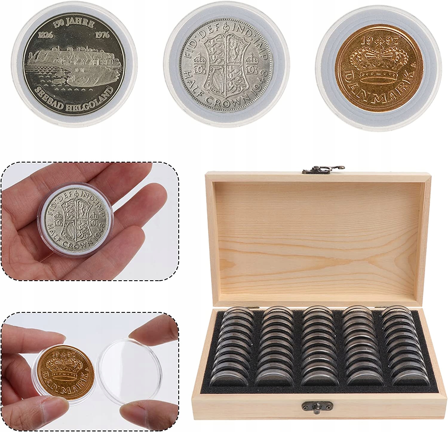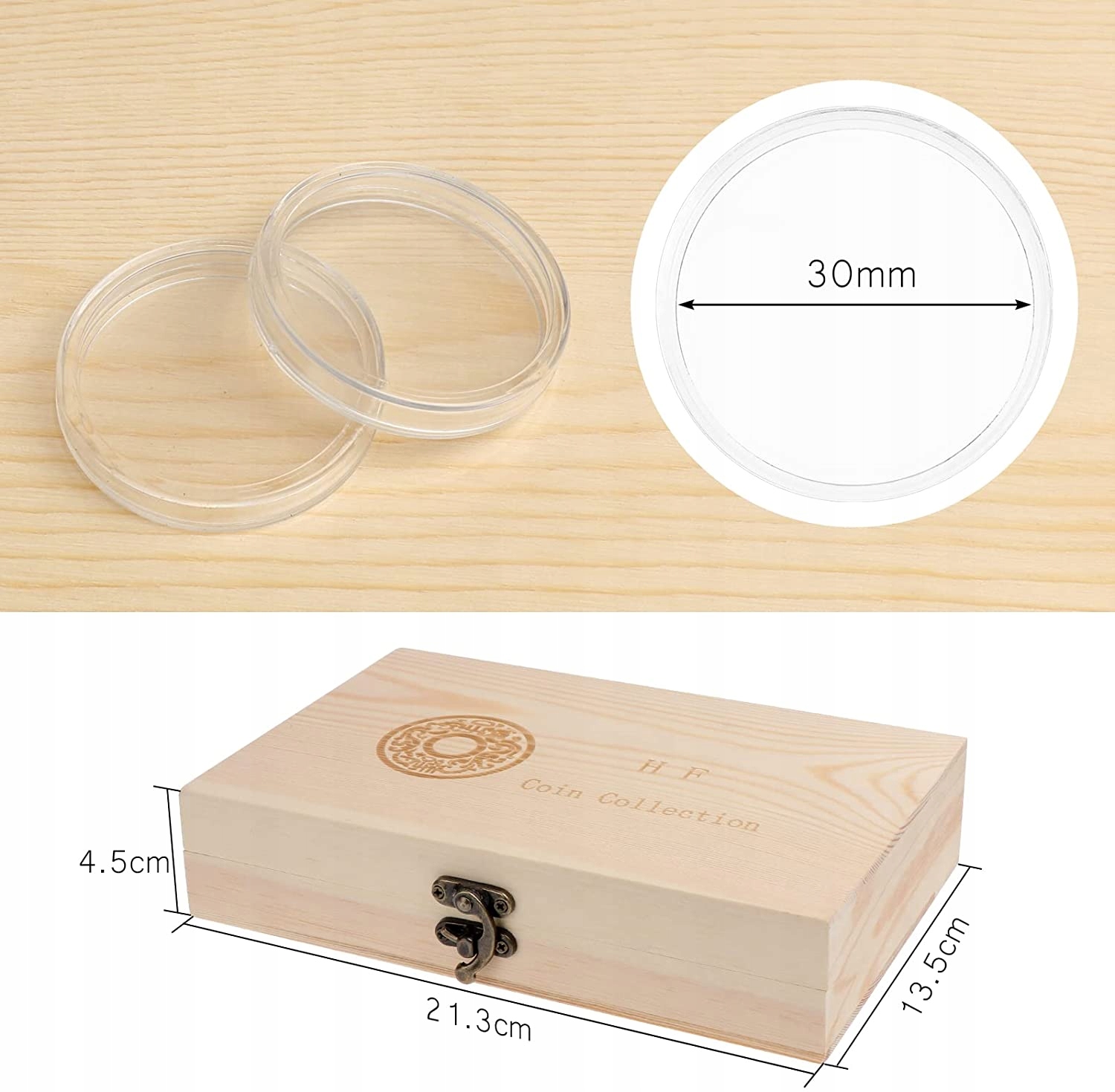 Размеры ящика для хранения примерно 213 x 135 x 45 мм, изготовлен из высококачественной сосны, вмещает 50 пластиковых капсул для монет. Прозрачные монетные капсулы облегчают хранение, просмотр и обмен монет.