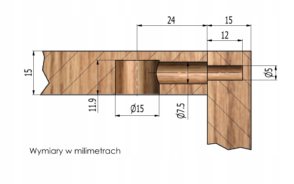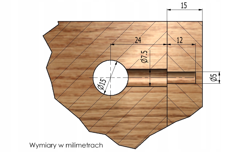 Для этого упражнения нам необходимо проделать отверстия для штифта (7,5 мм) и эксцентриков (диаметром 15 мм).