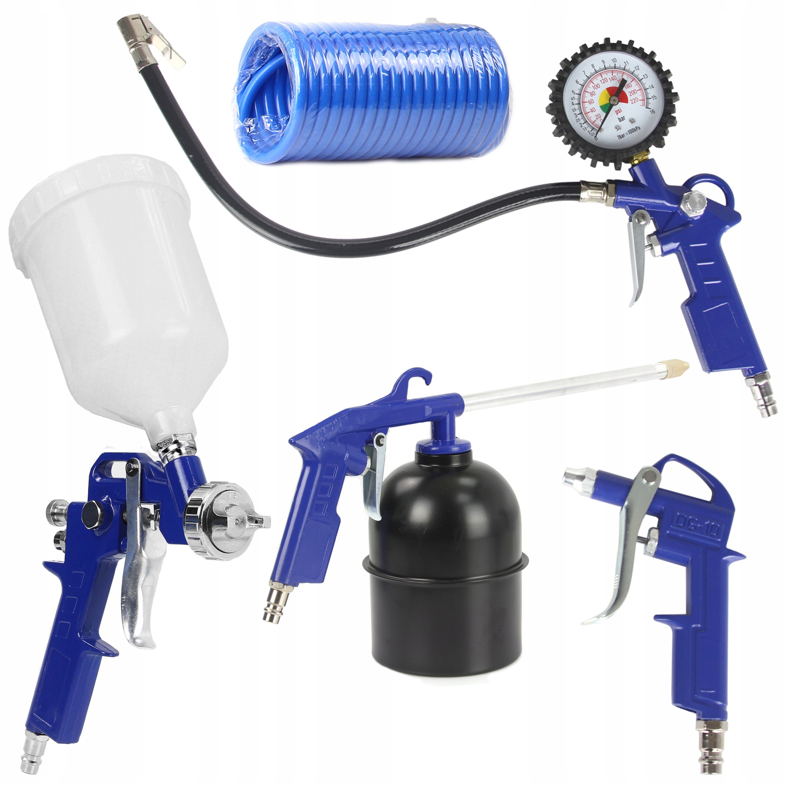 В комплект входят: обдувочный пистолет, масленка, пистолет для накачивания колес до 16 соток, малярный пистолет с насадкой 1,5 мм, пневматика 5 мб. шланг. В зависимости от поставки комплект может незначительно отличаться от представленного на фото.