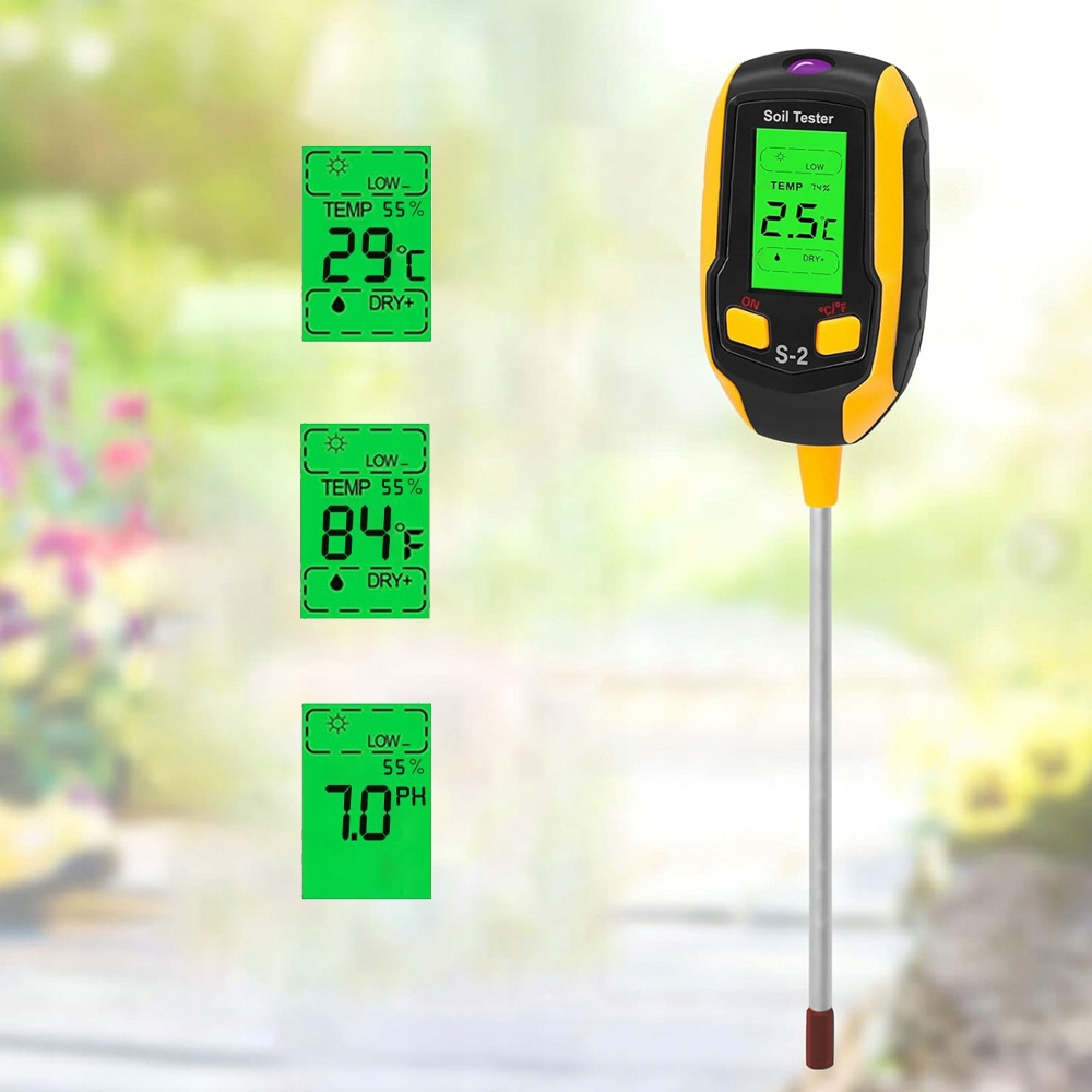- зонд с диаметром 200 мМ и окном датчика света обеспечивает точные и точные измерения в 5 единицах, измерение солнечного света (9 уровней), влажность почвы (5 уровней), pH почвы (12 уровней) и температура (° C и ° F) LCD: