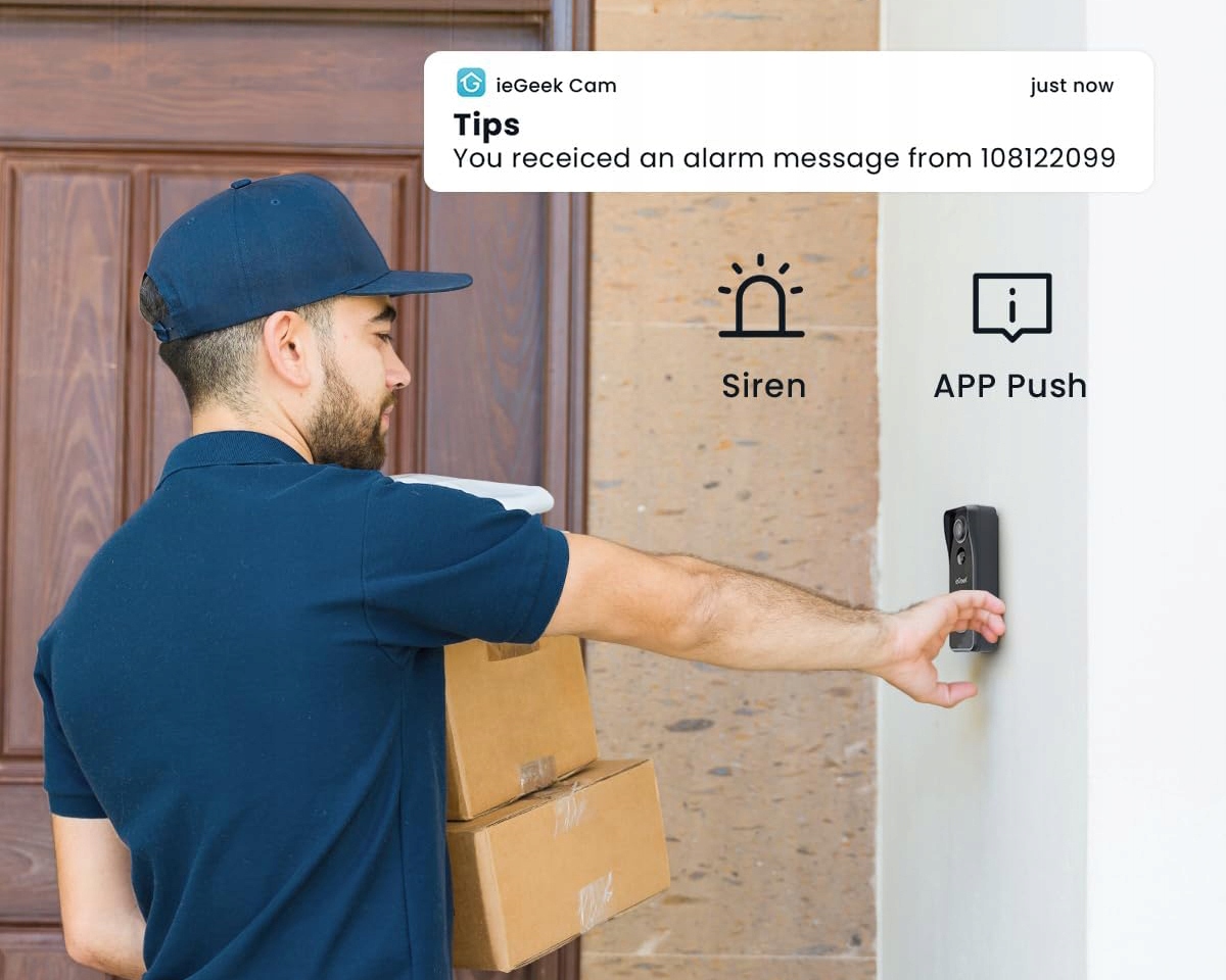 Умный дверной звонок ieGeek с камерой оснащен запатентованным PIR-датчиком движения с дальностью наблюдения до 20 футов. При обнаружении движения он отправит уведомление на ваш телефон в течение 3 секунд и запишет видео с гостями, приближающимися к двери. Вы можете поговорить с посетителями или включить будильник, чтобы предупредить незваных гостей.