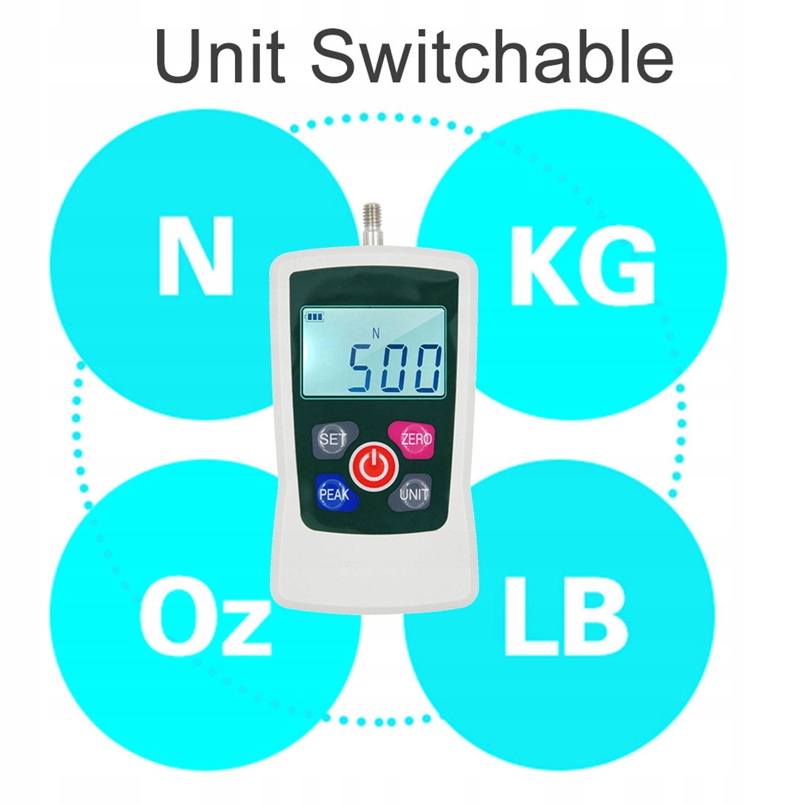 3. Универсальные режимы измерения: Измеритель давления и тяги предлагает три режима измерения: в реальном времени, пиковый и первый пиковый. Он также поддерживает четыре единицы преобразования: N, KG, LB и OZ, что обеспечивает гибкость для пользователей в различных областях и приложениях.
