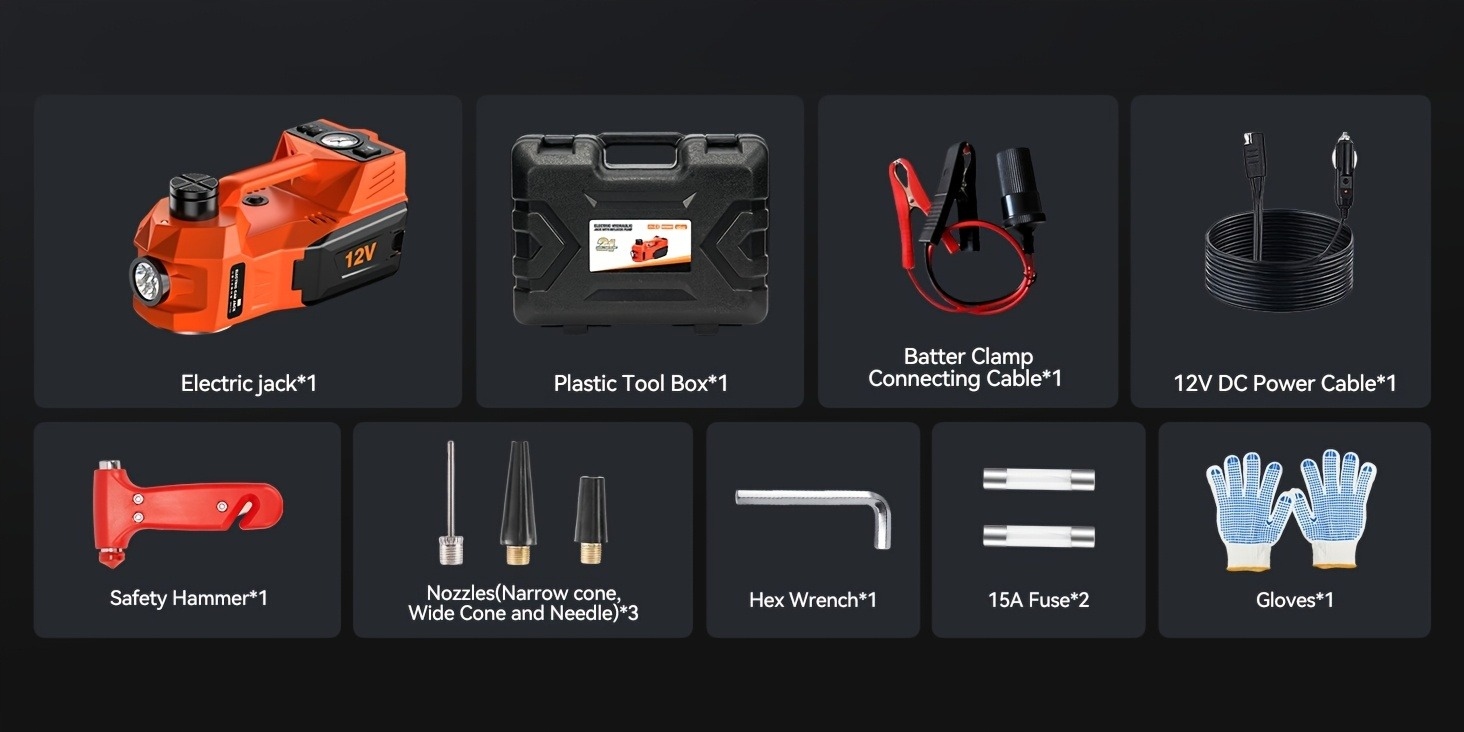 - Включает кабель с зажимом аккумулятора, кабель питания 12 В постоянного тока, различные надувные насадки, шестигранный ключ, предохранители на 15 А, перчатки и т. д. — все аксессуары, необходимые для использования, входят в комплект.