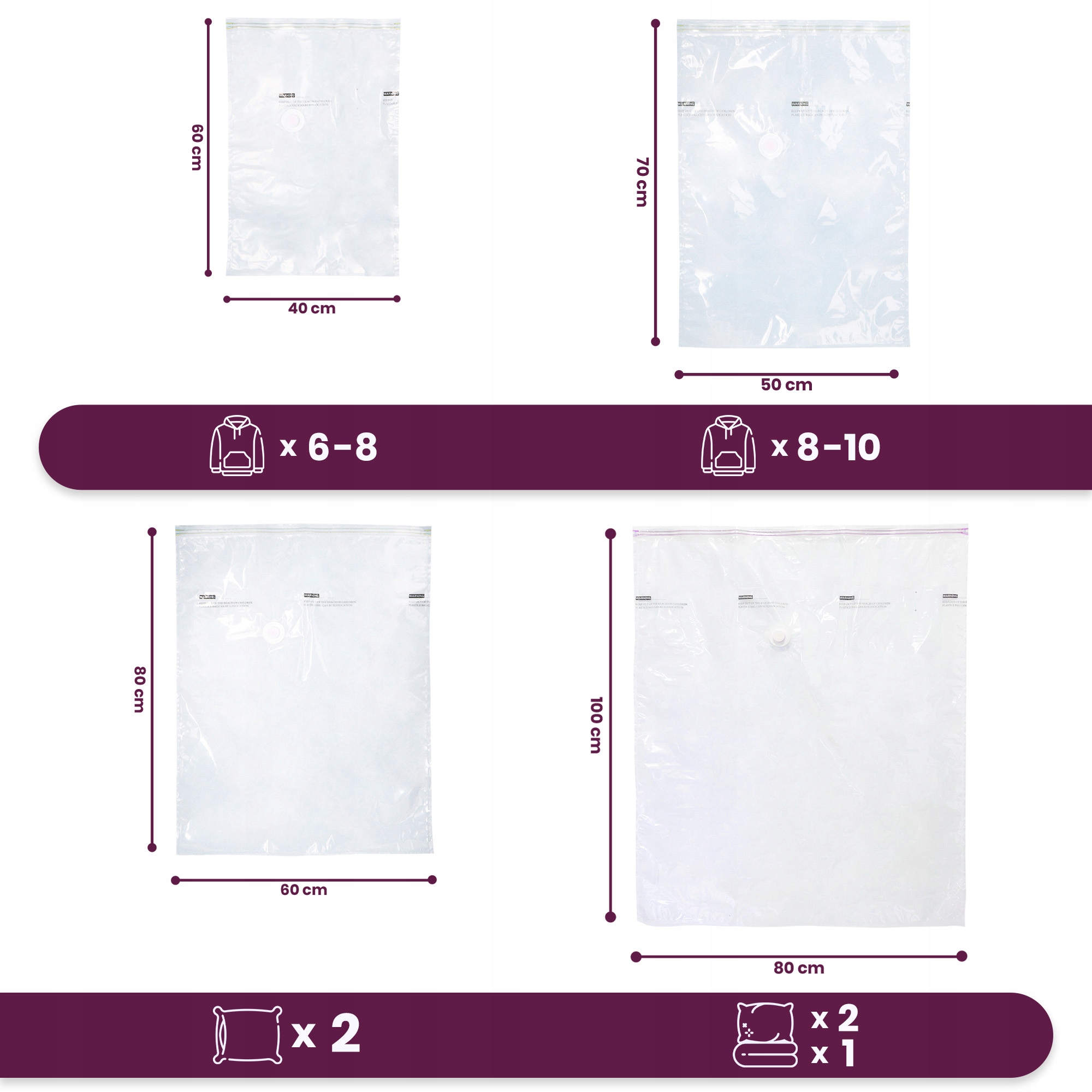 Вакуумные пакеты для одежды 2 х XS (40 см х 60 см), 1 х S (50 см х 70 см), 1 х М (60 см х 80 см), 1 х L (80 см х 100 см) с клипсами 2 шт