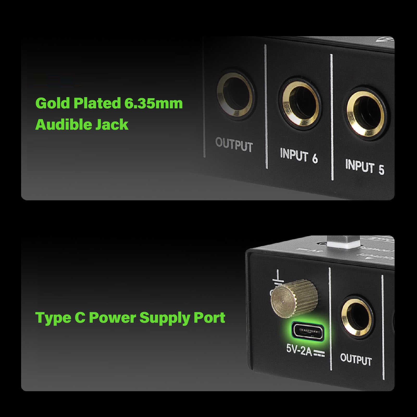 1. Стерео моно -переключение: этот миксер предлагает гибкую слышимую конфигурацию для удовлетворения различных потребностей. В случае стерео, используйте стерео кабель и переключатель 1/4 TRS; Для Mono используйте разъем 1/4 TS для смешивания до 6 сигналов в одном выходе