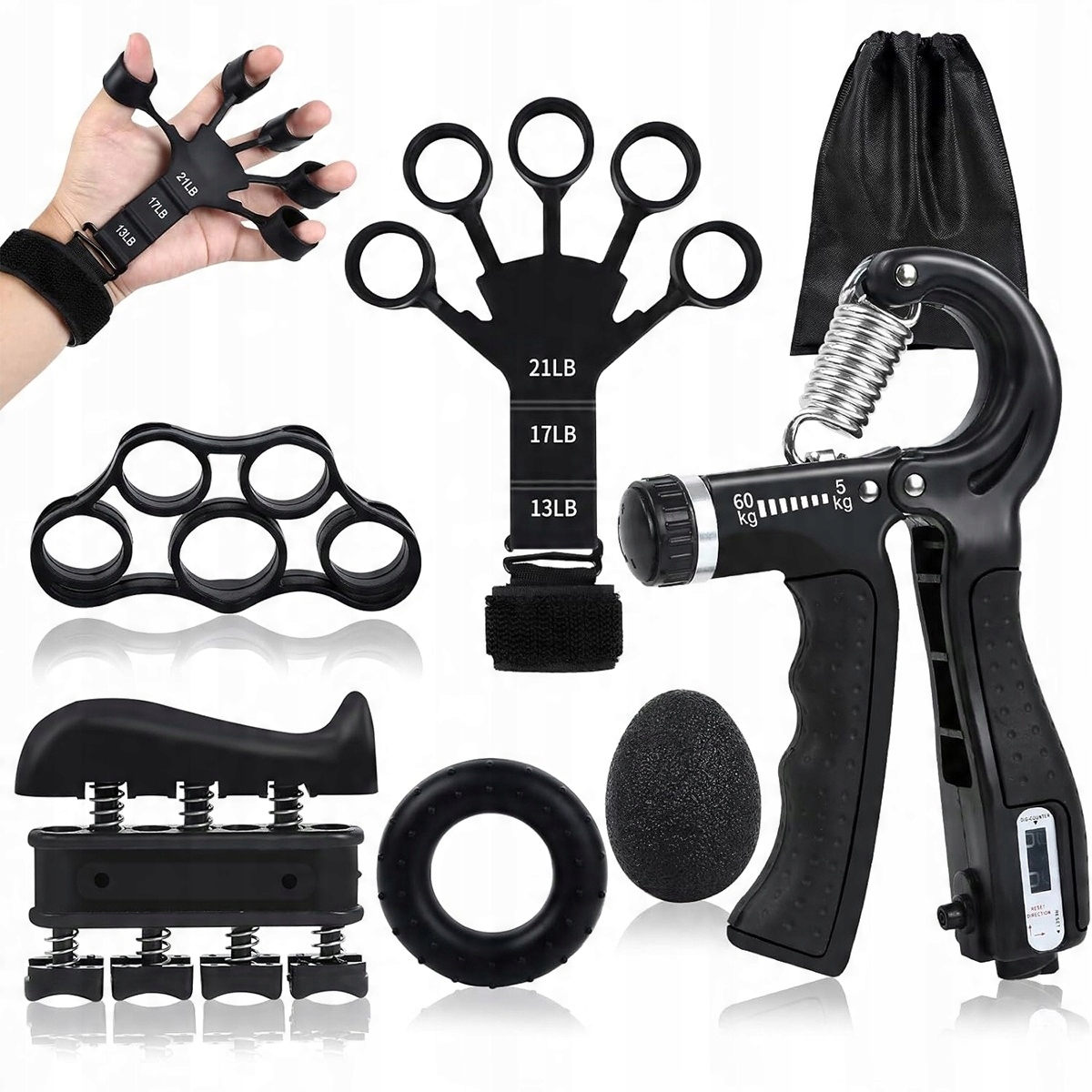 В комплект упражнений для хвата входит 1 регулируемый тренажер для хвата, 2 тренажера для пальцев, 1 растяжка для пальцев с браслетом, 1 кольцо для захвата и 1 шарик для снятия напряжения, включая сумку для хранения и инструкцию на английском языке. Тренажеры для силы рук, тренажеры для силы хвата и тренажеры для запястий работают вместе, чтобы развить силу и гибкость ваших кистей, пальцев, запястий, локтей и предплечий, а также расслабить мышцы рук.