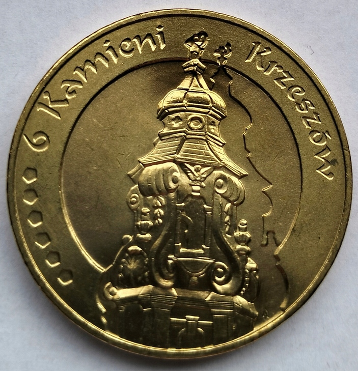Аверс: В центре Ратушная башня, вверху полукругом надпись: 6 КРЖЕШОВСКИХ КАМНЕЙ, слева 6 символических камней.