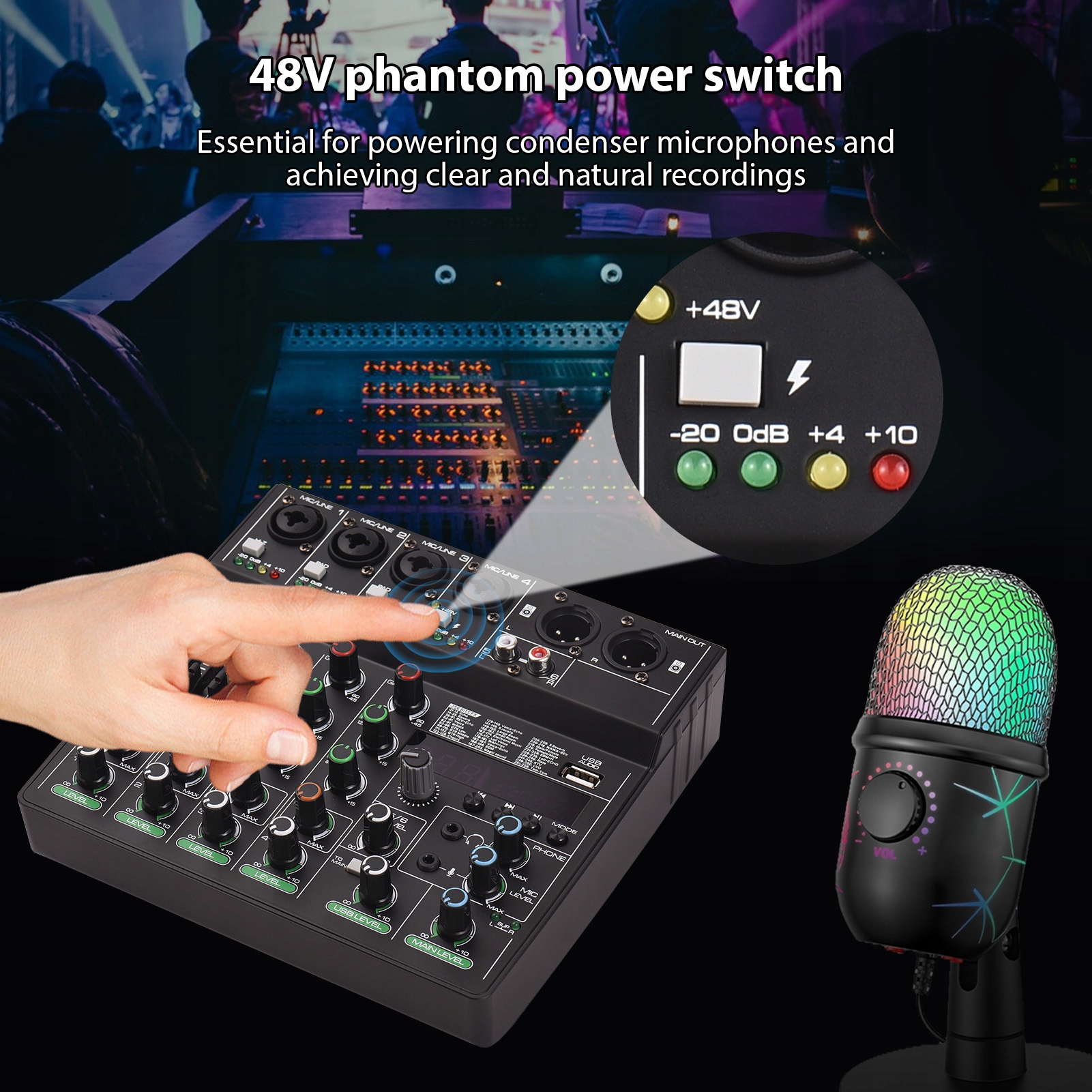 2. 【Расширенные возможности для смешивания】: с 256 встроенным источником питания Phantom 48 V, DJ Mixer предлагает исключительное качество и универсальность звука. Он имеет 4 микрофона с комбинацией XLR/Line, 1 пары входных стерео RCA и 1 пару выходов XLR, а также 1/8 дюймов для наушников.