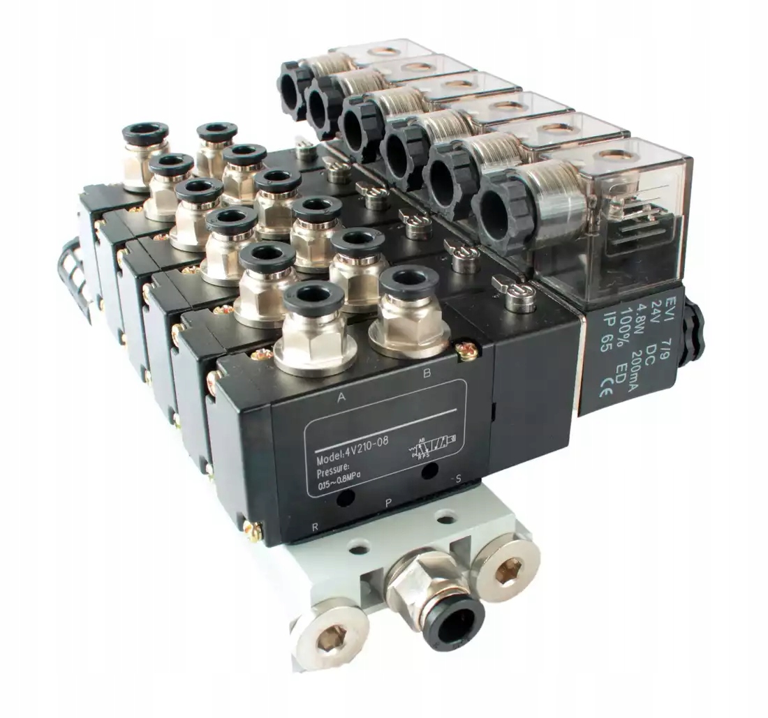 Пневматический клапанный остров, состоящий из 6 электромагнитных клапанов с функцией 5/2, с катушкой 24 В постоянного тока и вилкой со светодиодом и пневматическими аксессуарами.