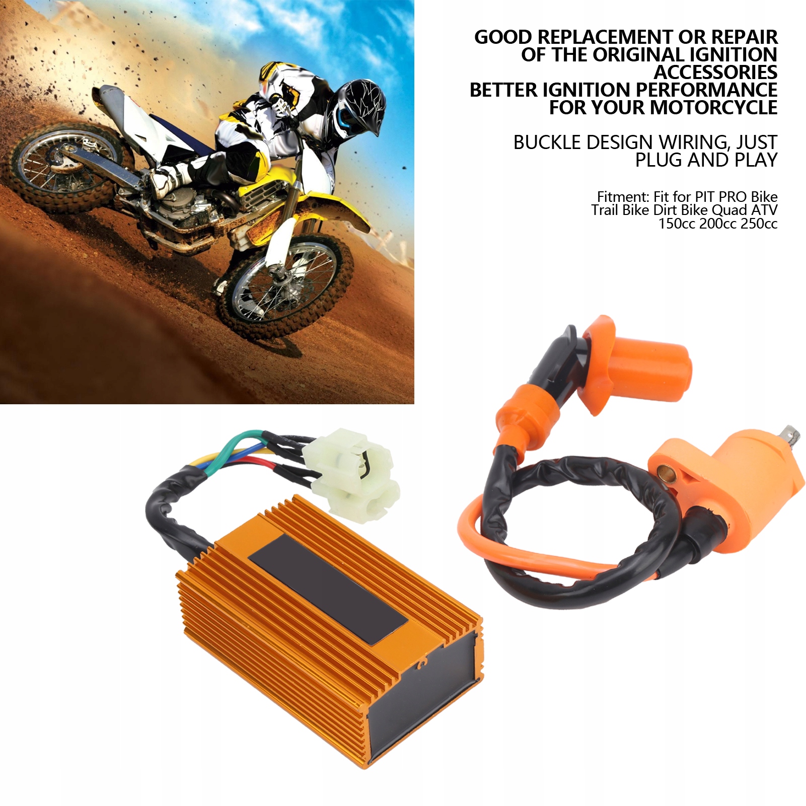 1, катушка зажигания + 6-контактный блок CDI, специально подходит для велосипеда PIT PRO, трейлового велосипеда, квадроцикла, квадроцикла 150cc 200cc 250cc. 2. Коробка из высококачественного алюминиевого сплава, полировка методом волочения, защита от коррозии, окисления и высокая долговечность. 3. Идеальная замена или ремонт оригинальных поврежденных или сколов аксессуаров зажигания, лучшая производительность зажигания для вашего мотоцикла. 4. CDI помогает ускорить повышение вторичного напряжения, искра зажигания становится более стабильной и мощной, а также обеспечивает быстрое зажигание. 5, проводка имеет конструкцию пряжки, просто подключи и работай, идеально сочетаясь с вашим оригинальным мотоциклом.
