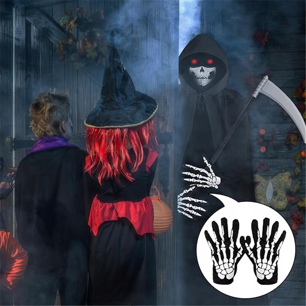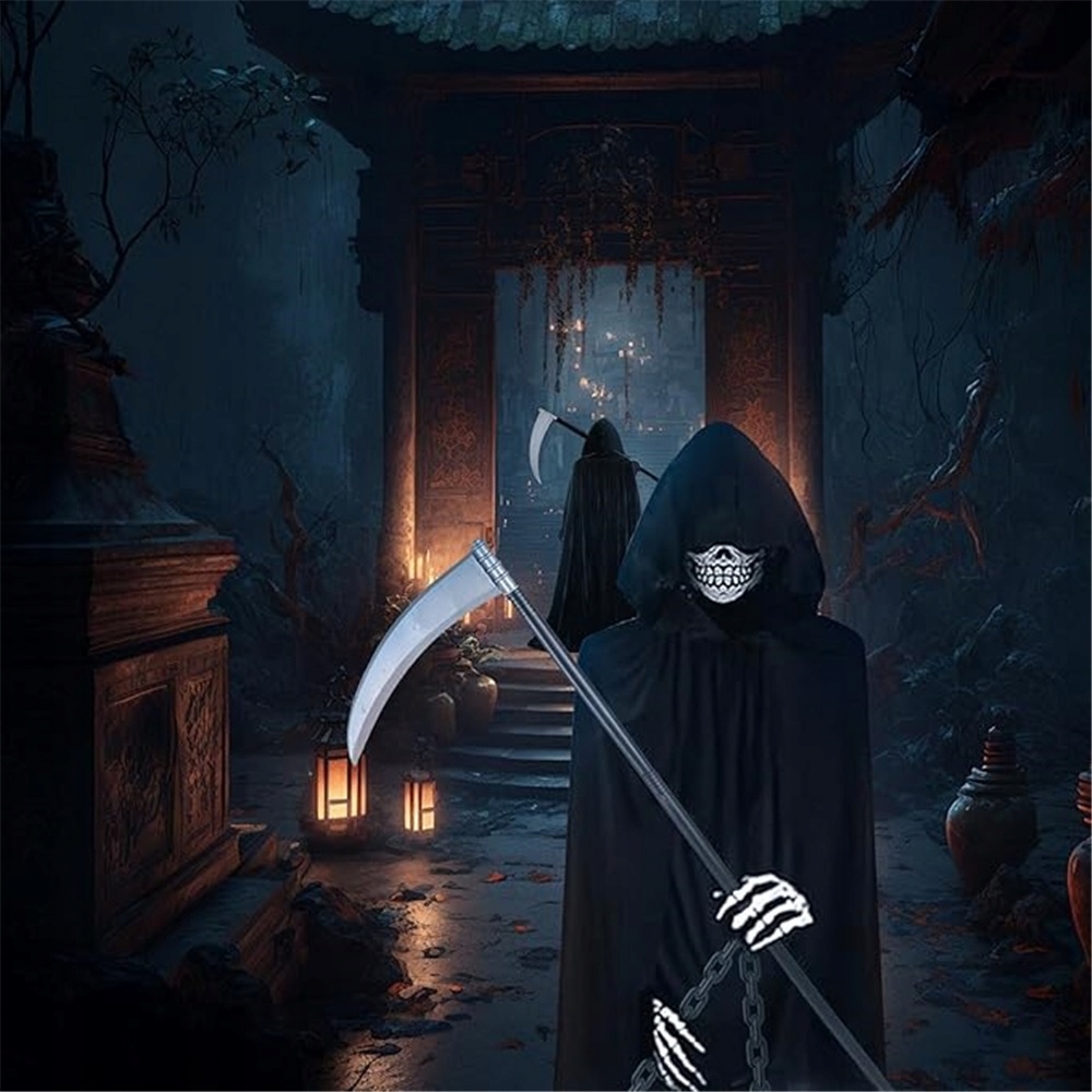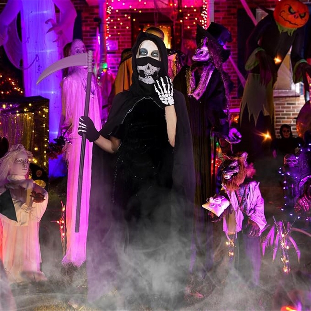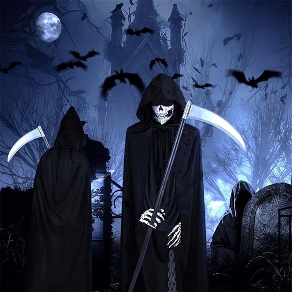 ☠️☠️☠️Набор костюмов Мрачного Жнеца для мужчин и женщин: Наш комплект костюмов Мрачного Жнеца для взрослых включает в себя черную накидку с капюшоном, маску-череп, перчатки с черепом, ожерелье, очки со светящимися линзами и пластиковую косу, обеспечивающие удобный и безопасный реквизит для макияжа на Хэллоуин. Этот взрослый костюм Мрачного Жнеца идеально подходит для ролевых игр на Хэллоуин как мужчинам, так и женщинам.